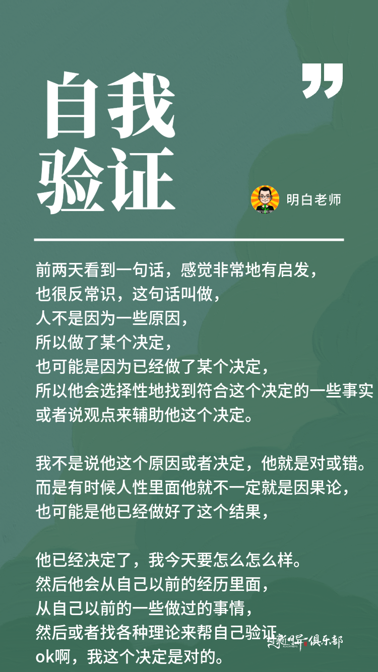 就比如有的人可能在职场想要换一份工作。一般来说他可能会觉得是,因为这份工作不适合我,因为这个工作太累,因为这个工作他的工资太低,所以他要决定,我换一份工作。但有可能也是因为另外一个原因,就是他已经心里决定了,我要换一份工作了,他已经下了这个决定了,然后他会找到很多支持他这个决定的因素。