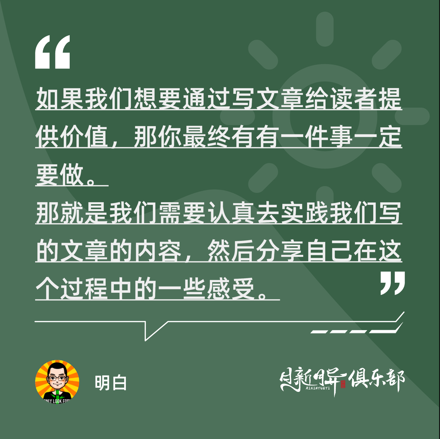 所以这个问题呢,最终的答案就是,如果我们想要通过写文章给读者提供价值,那你最终有有一件事一定要做,那就是我们需要认真去实践我们写的文章的内容,然后分享自己在这个过程中的一些感受。