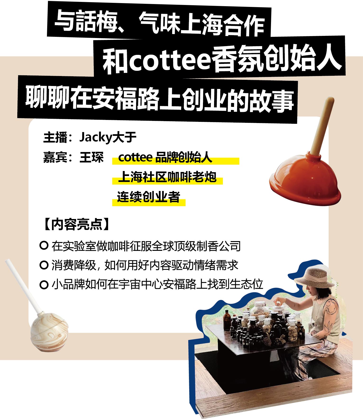 从上海社区咖啡老炮到勇闯安福路的香氛品牌创始人,连续创业者王琛(老王)是上海精致小商业发展的参与者和见证者。她创立的cottee,凭借皮搋子造型咖啡味道香薰出圈,又凭借“耍小牌”、“我有伞哈哈哈”等有趣文案持续受到关注。