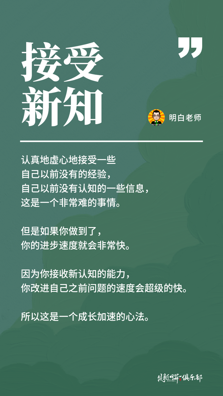 但是如果你做到了,你的进步速度就会非常快。因为你的接收新认知的能力,你改进自己之前问题的速度会超级的快。所以这是一个成长加速的心法。