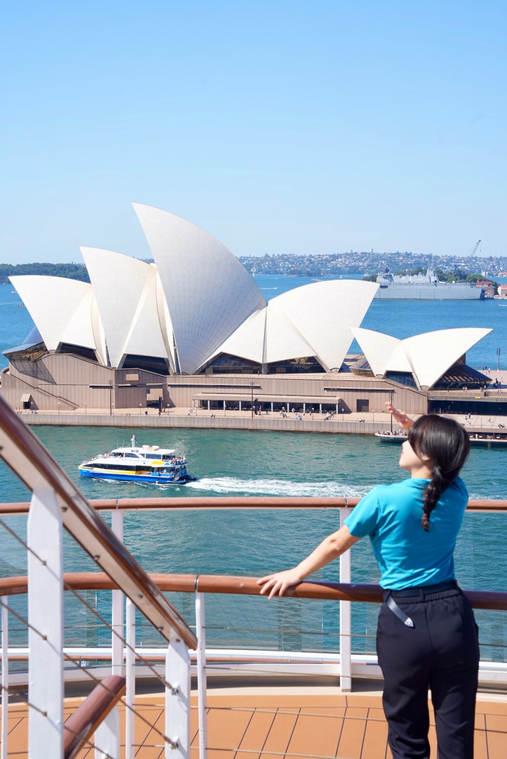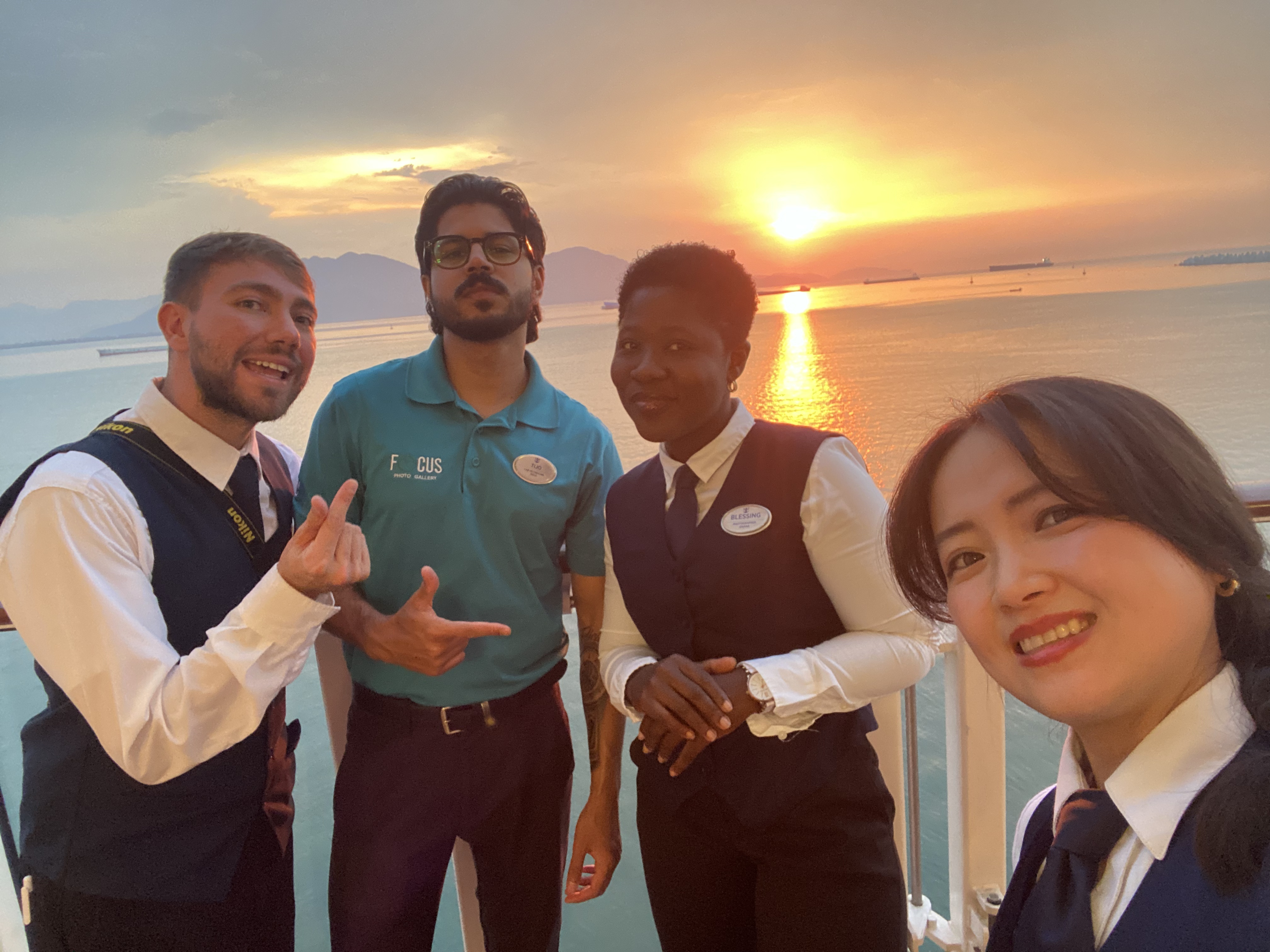一艘大型游轮上,大概有5000人,她的工作是为游客拍照。在每一个航海日和停港日,她都会站在甲板上,看大海上不同颜色的日落。