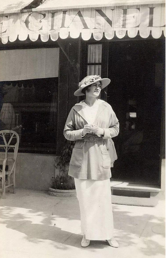 1913年香奈儿在多维尔分店门口穿着自己设计的度假服:
