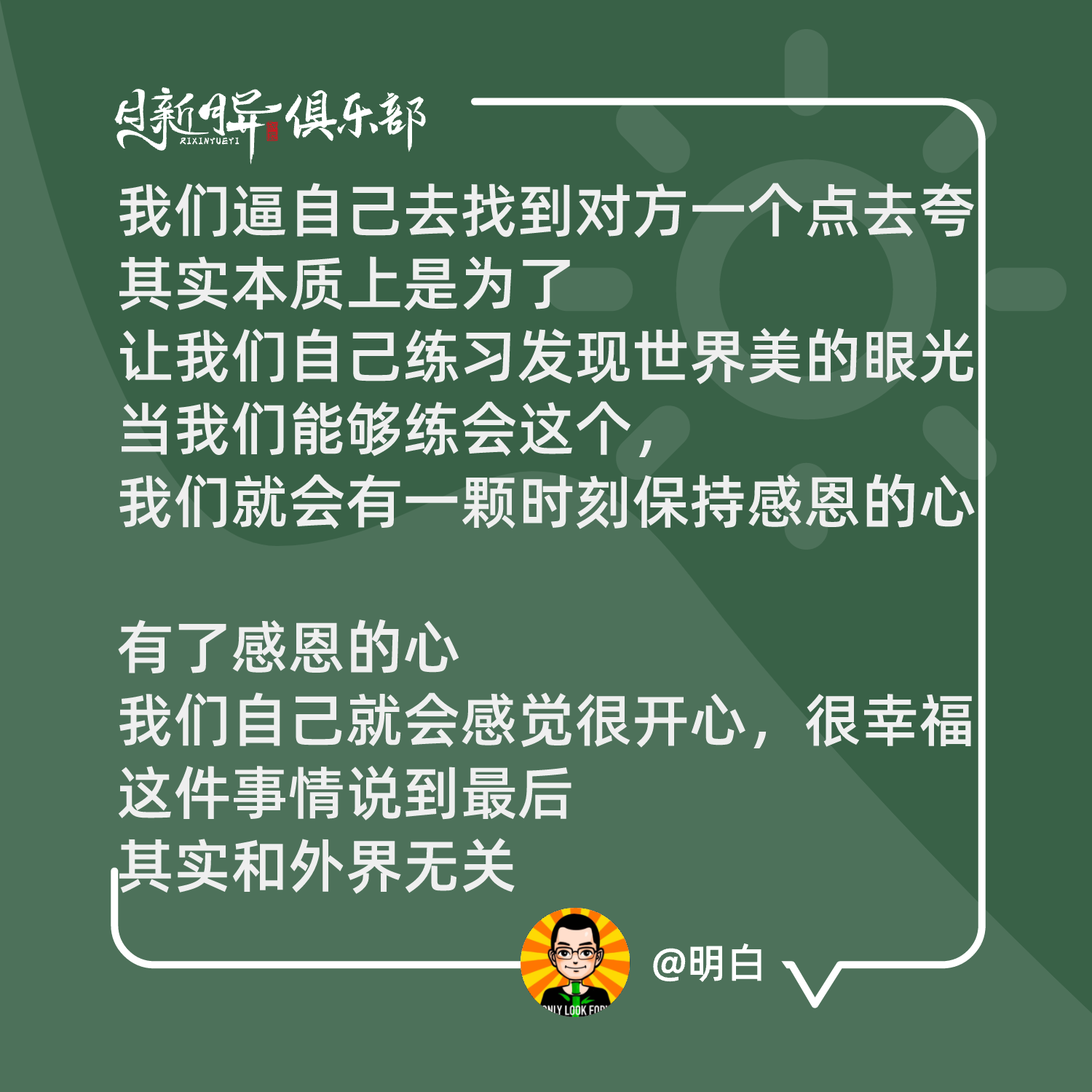 所以我们逼自己去找到对方一个点去夸,其实本质上是为了让我们自己练习发现世界美的一个眼光,当我们能够练会这个,我们就会有一颗时刻保持感恩的心。