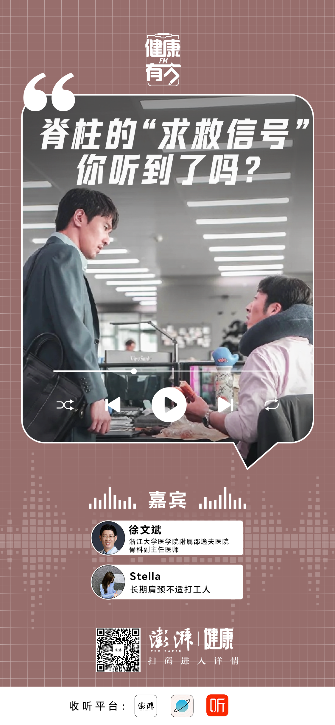 很多疾病的进展,是因为长时间忍受痛苦,忽略了身体的警告。本期《健康有方FM》邀请浙江大学医学院附属邵逸夫医院骨科医生、《知脊:徐医生告诉你的事》作者、科普大V徐文斌,以及长期遭遇肩颈不适的打工人代表Stella,共同讨论如何守卫我们的脊柱健康。