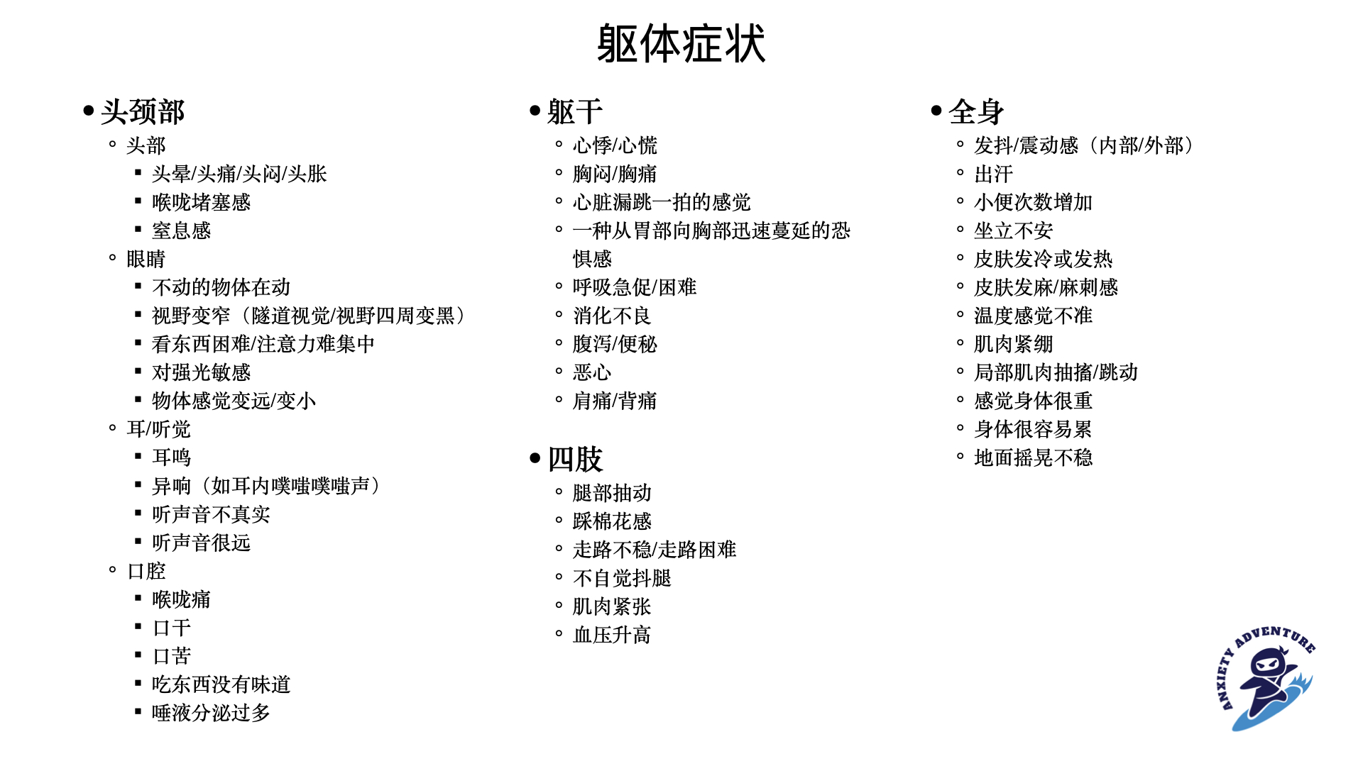本期介绍焦虑症的躯体症状,包括躯体症状是什么、主要有哪些表现、为何产生,以及出现的时候应该怎么办。
