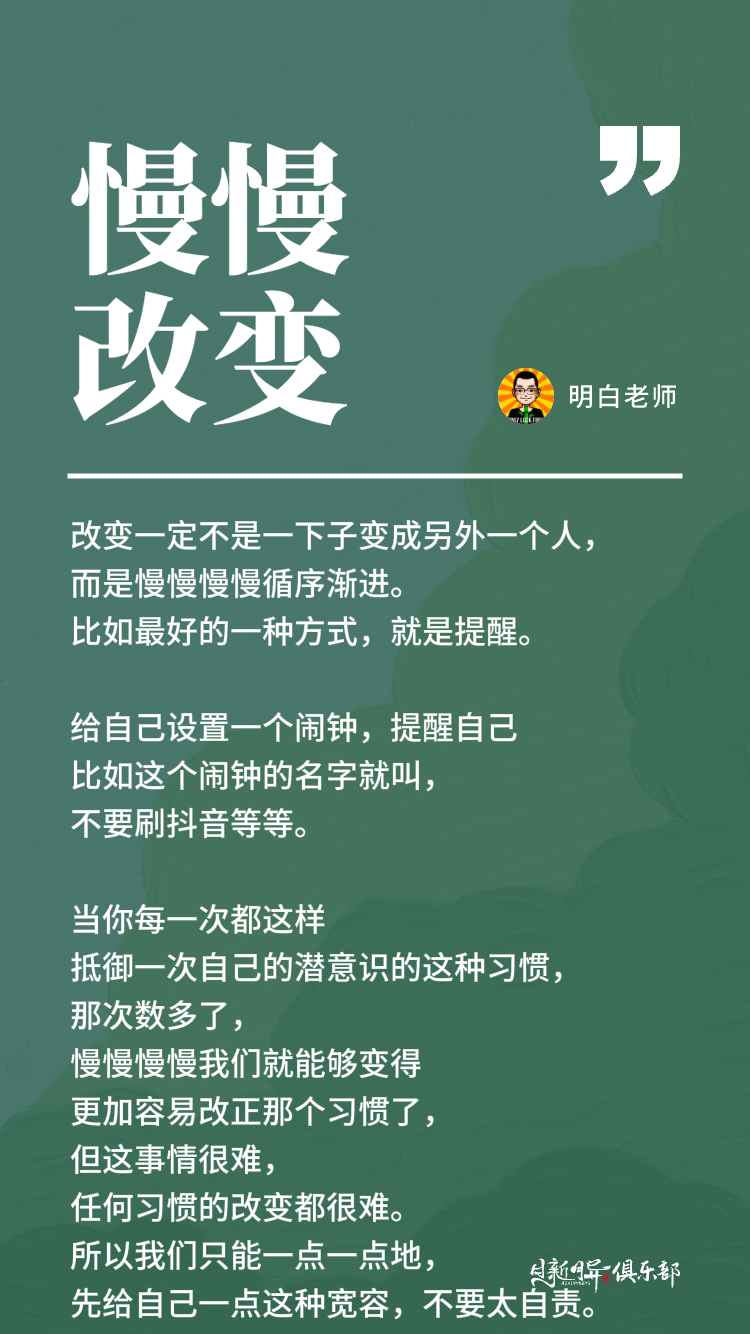 那这个改变一定不是一下子变成另外一个人,而是慢慢慢慢循序渐进。比如最好的一种方式,就是提醒。每个人其实都知道刷抖音是不好的,但是我们还是忍不住就去刷。因为我们没有一个人提醒你刷抖音是不好的。
