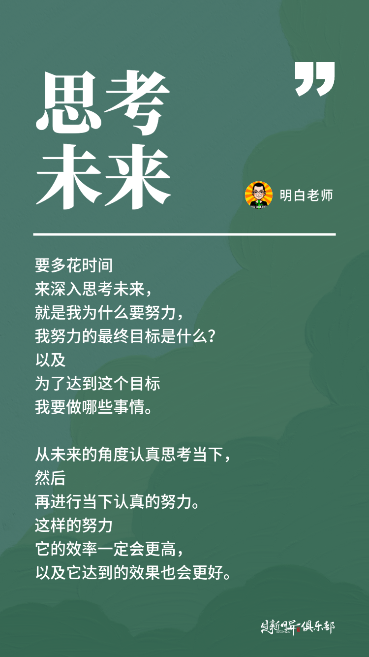 从未来的角度认真思考当下,然后再进行当下认真的努力。这样的努力我觉得它的效率一定会更高,以及它达到的效果也会更好。