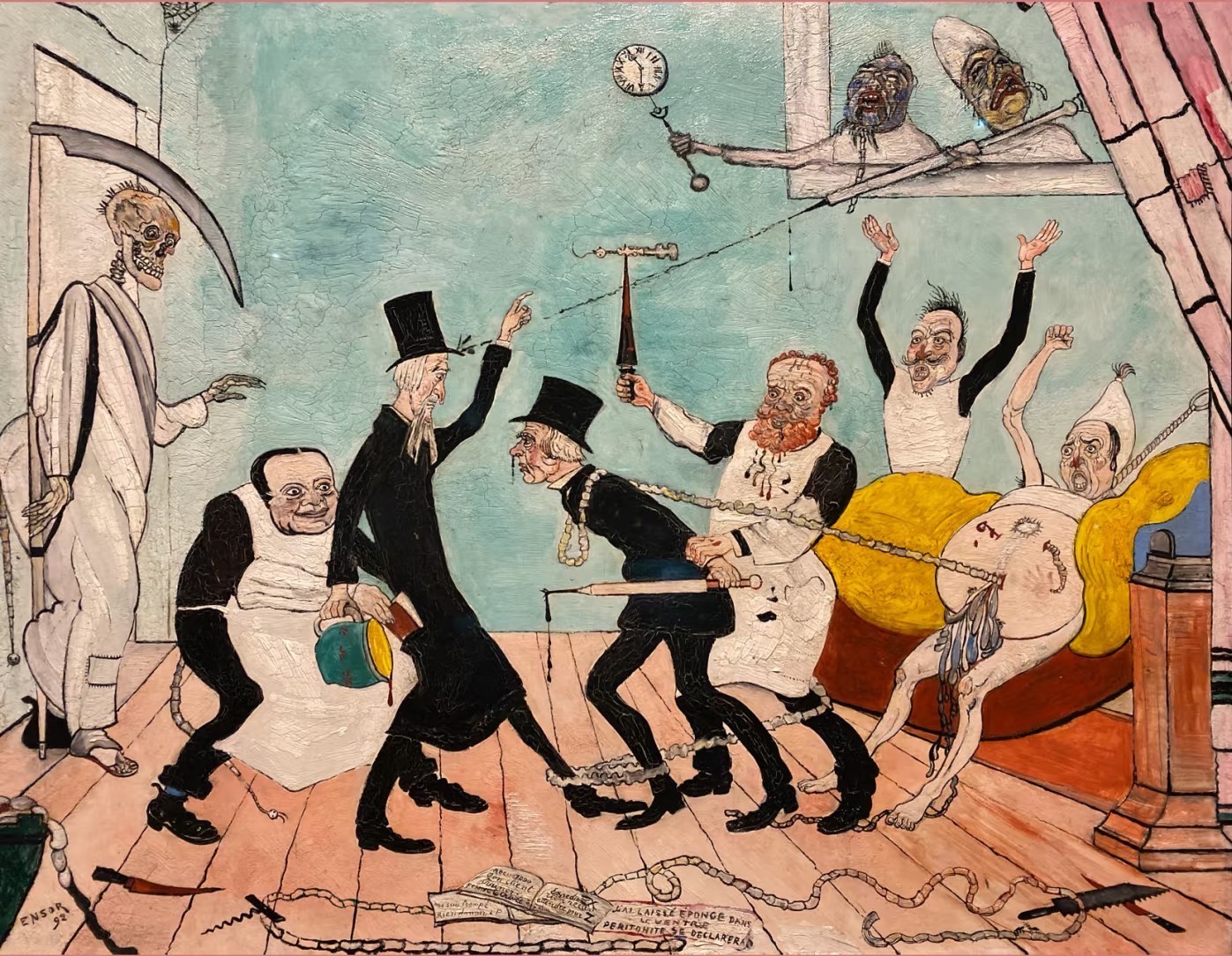 恩索尔把他们描绘成了谋财害命的庸医是有原因的——1892年,一场霍乱席卷比利时。医生们一时束手无策,成为了大众攻击的对象。