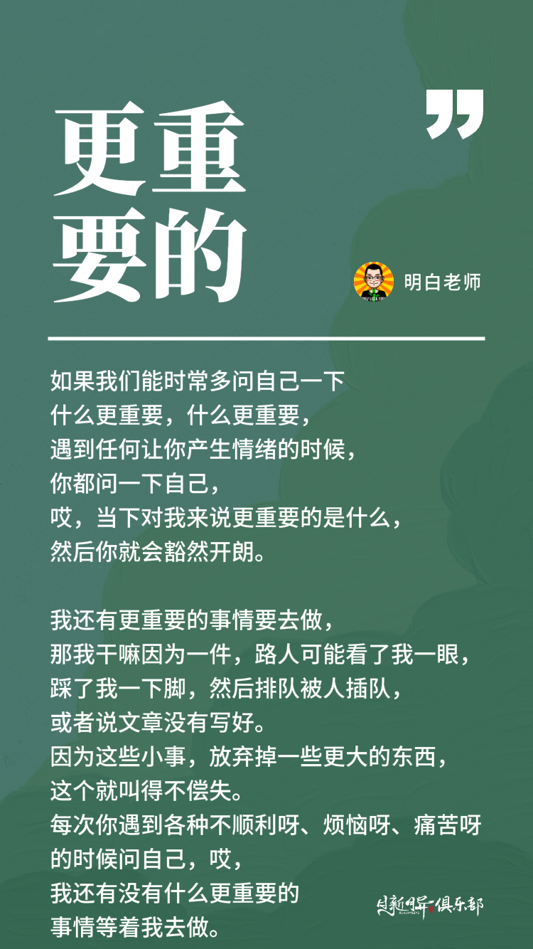 但是如果我们能时常多问自己一下什么更重要,什么更重要,遇到任何让你产生情绪的时候,你都问一下自己。哎,当下对我来说更重要的是什么,然后你就会豁然开朗。而且我还有更重要的事情要去做,那我干嘛因为一件,路人可能看了我一眼,踩了我一下脚,然后排队被人插队,或者说文章没有写好,因为这些小事,放弃掉一些更大的东西,这个就叫得不偿失。