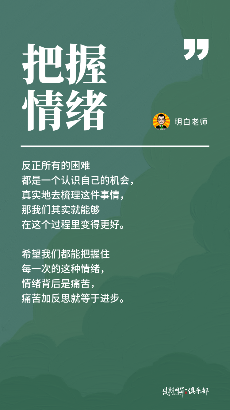 情绪不只是来带给我们痛苦的,它也能够带给我们反思,让我们看到更真实的自己,看到自己的一些确实懒惰、确实不够重视、确实可能不想为自己的人生负不想做决定、有可能是受害者模式、习得性无助。反正所有的困难都是一个认识自己的机会,真实地去梳理这件事情,那我们其实就能够在这个过程里变得更好。
