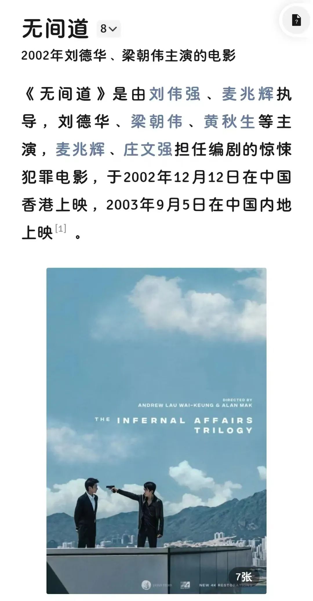 《无间道》于2002年拍摄;2002年12月上映;共三部,分别为:《无间道》、《无间道Ⅱ》(Infernal Affairs Ⅱ)、《无间道3:终极无间》。《无间道》是寰亚电影发行公司于2002年出品的一部警匪片,由刘伟强、麦兆辉执导,刘德华、梁朝伟、黄秋生、曾志伟等主演。