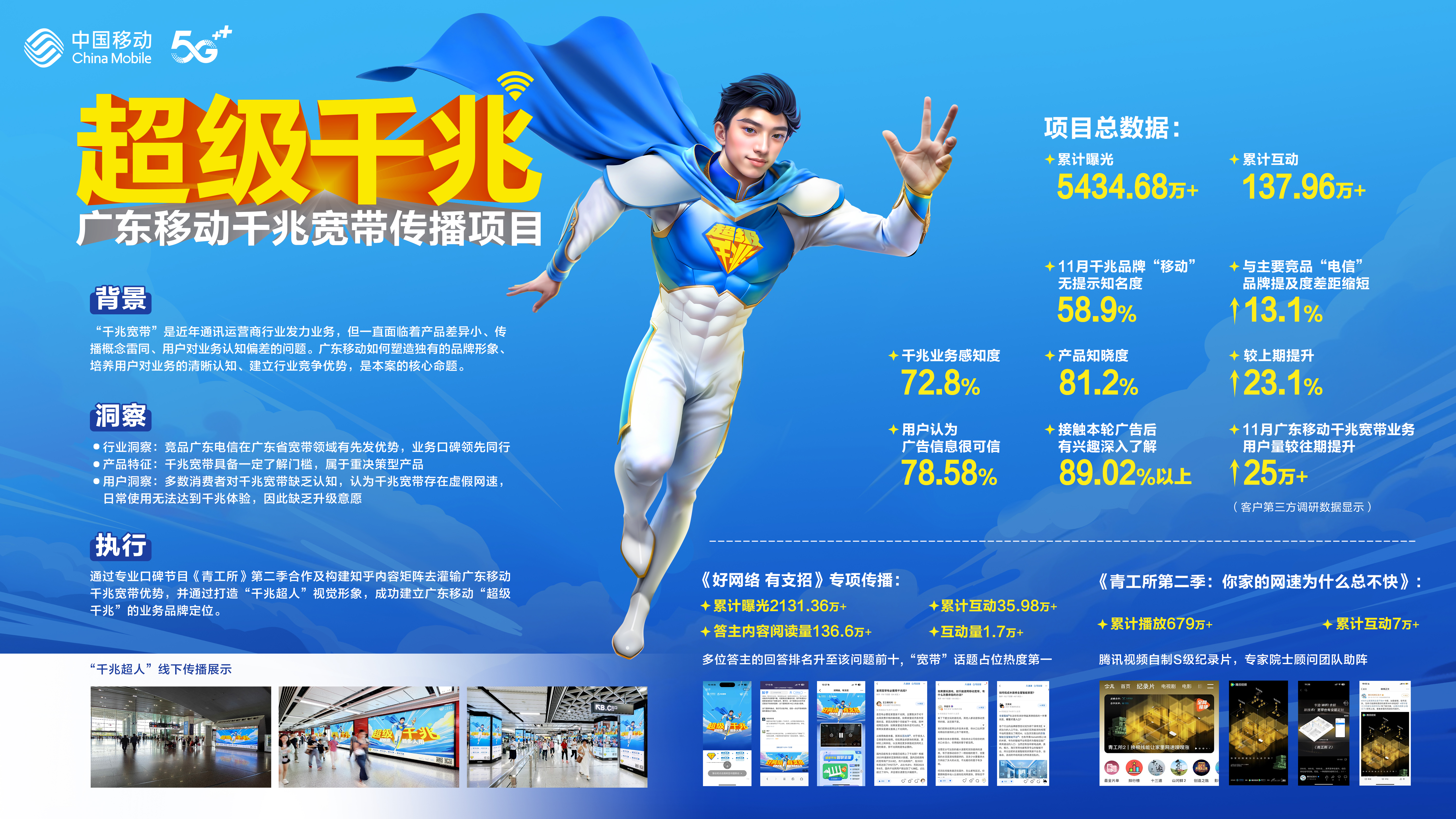在千兆宽带市场竞争中,广东移动面临着产品差异小、传播概念雷同的挑战。为了突围,广东移动打造了“超级千兆”品牌形象,通过定制“T字”传播模型,线上与腾讯视频合作推出科普纪录片,线下通过“千兆超人”视觉符号在地铁、高铁、机场等场景广泛铺开。这一系列举措不仅提升了品牌认知度,还通过专业内容和视觉符号的结合,构建了广东移动“超级千兆”的差异化形象,推动了千兆宽带业务的广泛传播。