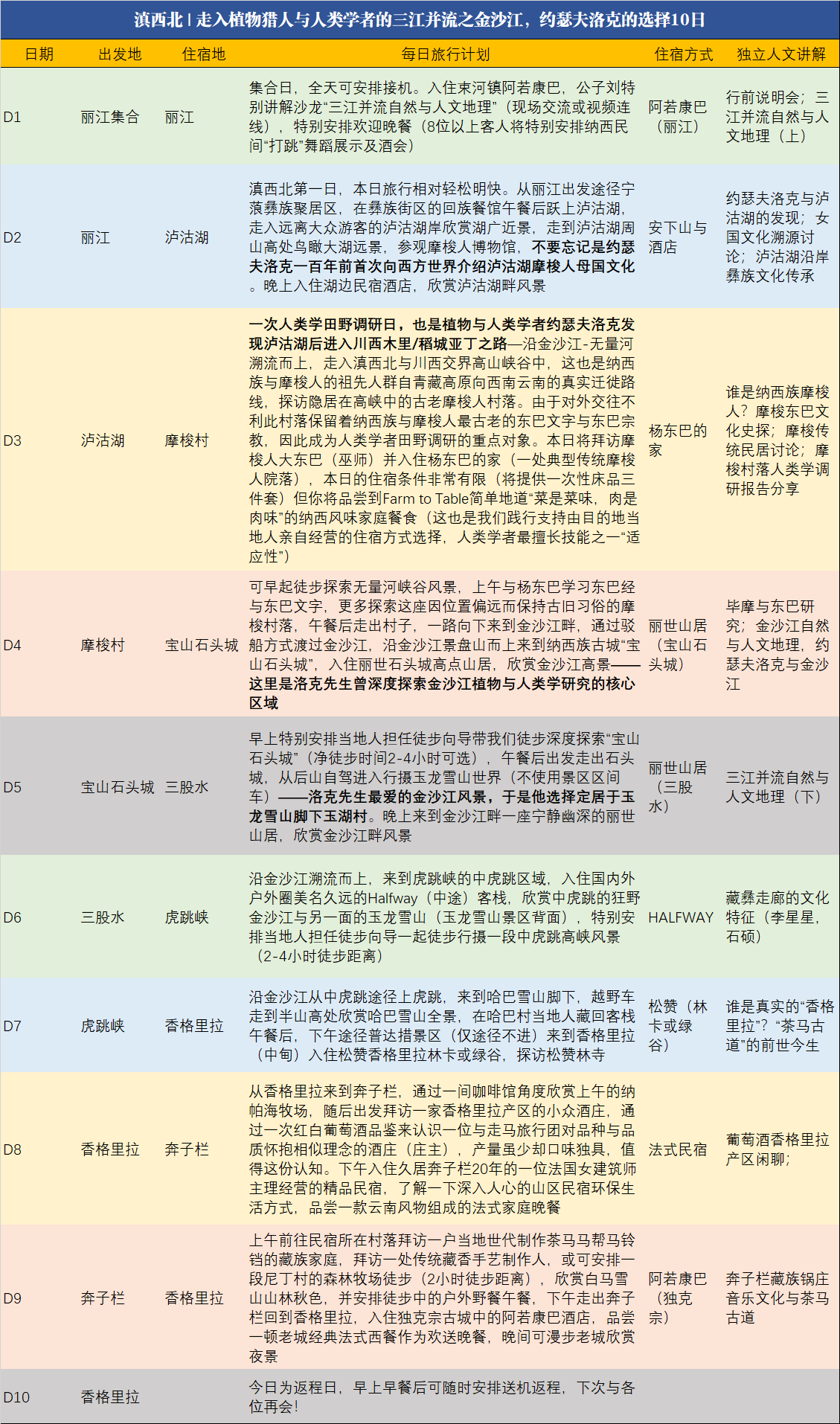 作为约瑟夫洛克先生百般珍爱的半生世居地,金沙江的可探索区域较大(丽江与香格里拉之间),探索方式较多(越野加徒步),拥有纳西族-摩梭人的典型东巴文化特征——在深入金沙江与川西交界一处完整保留古东巴文化的村落,我们将拜访一位备受人类学者敬重的摩梭人大东巴(巫师祭司);在白马雪山脚下的金沙江畔,我们将通过更多热爱云南的外国旅居者的视角去重新认识“香格里拉”,通过对一家金沙江畔与我们同样坚持独立小众精神的葡萄酒庄拜访了解他们对这处“风土”的感悟。