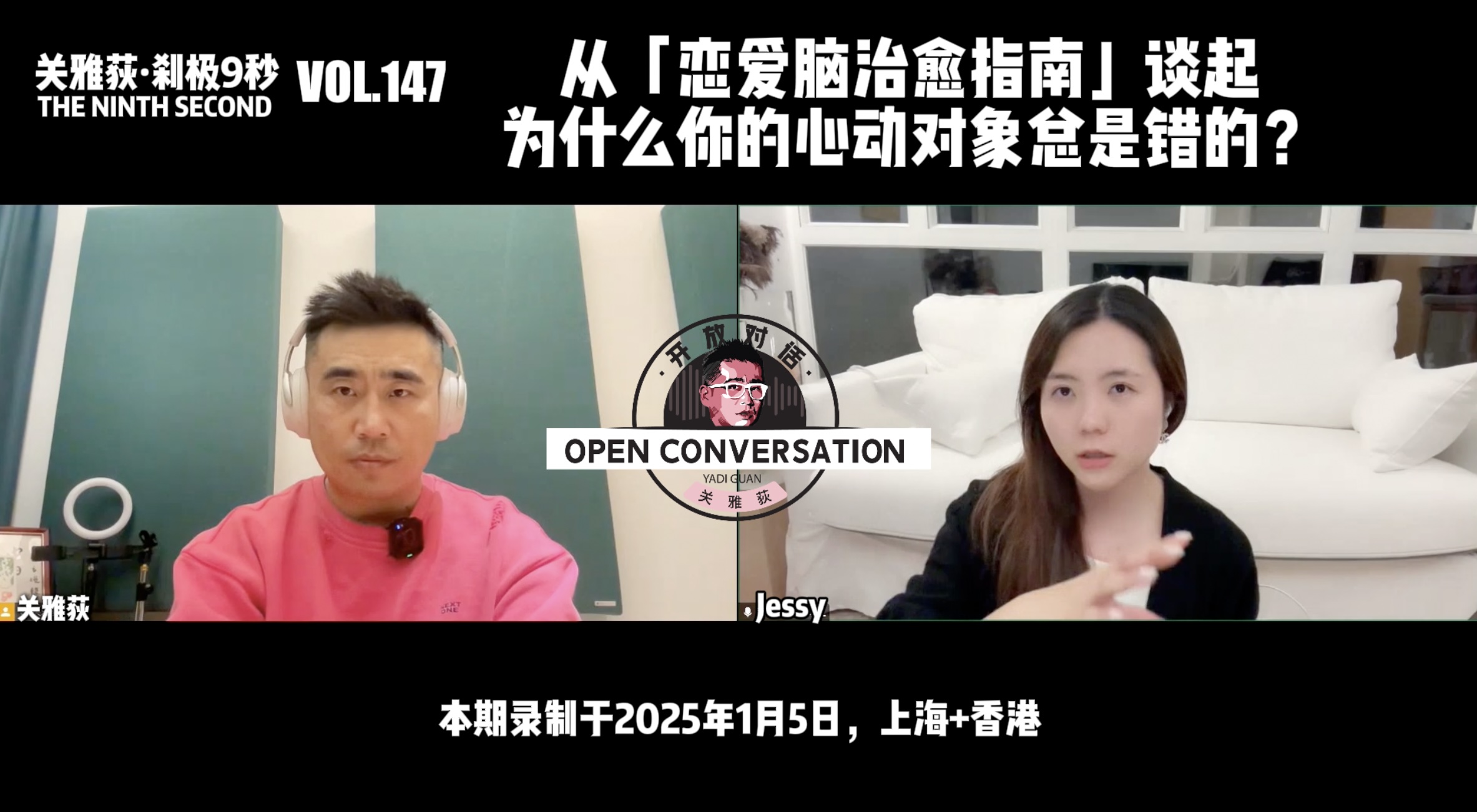 关于"心动"与"择偶标准"的矛盾,两位嘉宾展开了深入讨论。Jessy认为,很多人会被娱乐行业和消费主义塑造的浪漫想象所困扰,将并非真正的爱情的感觉误认为是命中注定。她建议要区分真正能够共同成长、共度一生的伴侣特质与表面的吸引力。关雅荻则分享了自己的经历,强调在寻找伴侣的过程中要保持开放和耐心,她与现任配偶从相识到确定关系用了一年半的时间。