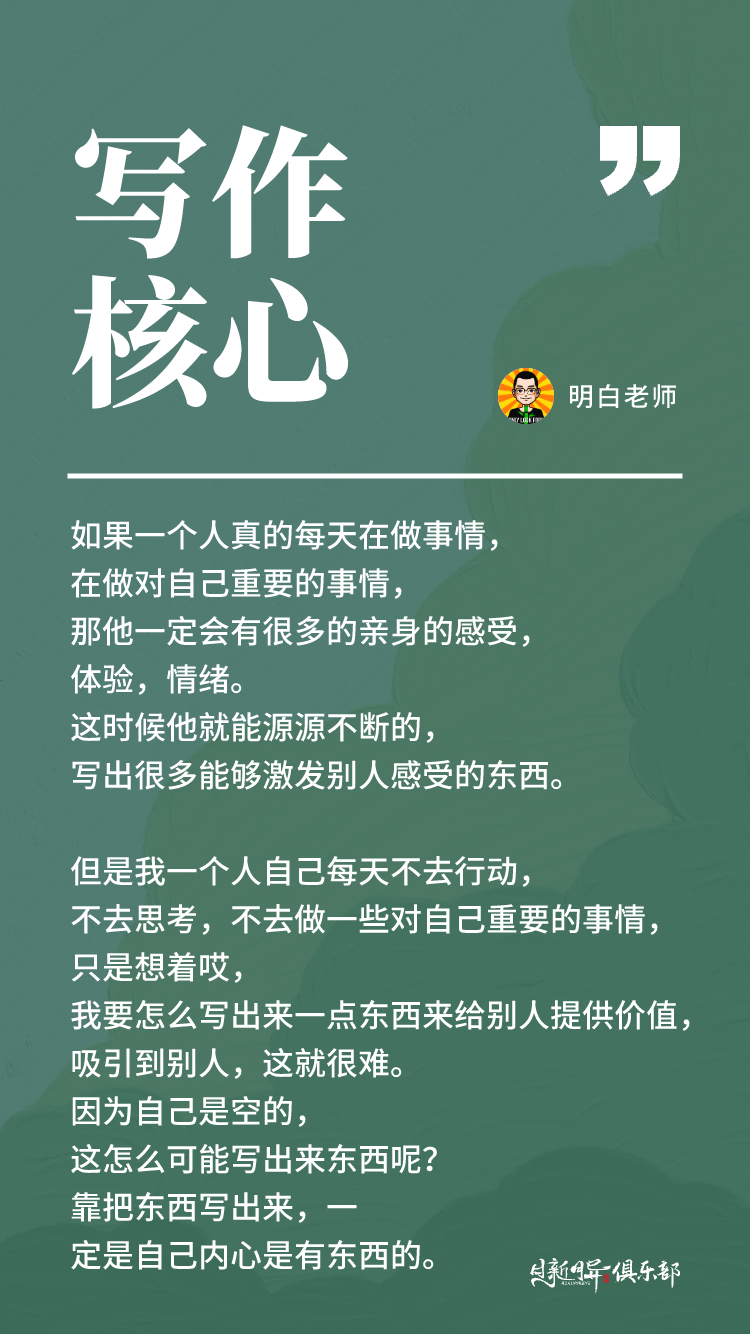 然后他说因为我这段时间确实在认真做一些事情,所以我就有很多话想要讲。然后我当时听到这里,就觉得嗯他理解了写作的最核心的东西了,写作的最核心的东西,其实就是自己的成长。