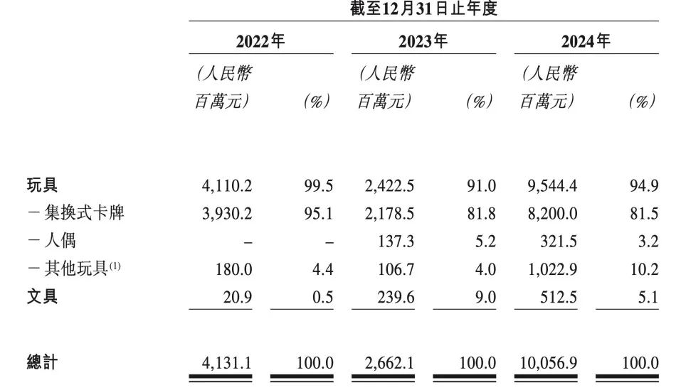 “谷子” 作为二次元圈内对动漫、游戏 IP 等周边产品的别称,催生了 “谷子经济”。其产品多为低定价、高消费频的软周边,像卡牌、吧唧等都是热门品类。卡游是国内最大的卡牌品牌商,2024 年集换式卡牌零售额达 82 亿元,市占率 71.1%。并且,卡游的产品线不断拓展,延伸至吧唧、立牌等多个谷子品类,还跨界进入文具行业,2024 年文具业务零售额达 5.13 亿元,市占率 24.3%,均排名第一。从收入结构来看,卡游收入多元化趋势明显,集换式卡牌收入占比下降,其他玩具收入占比上升。