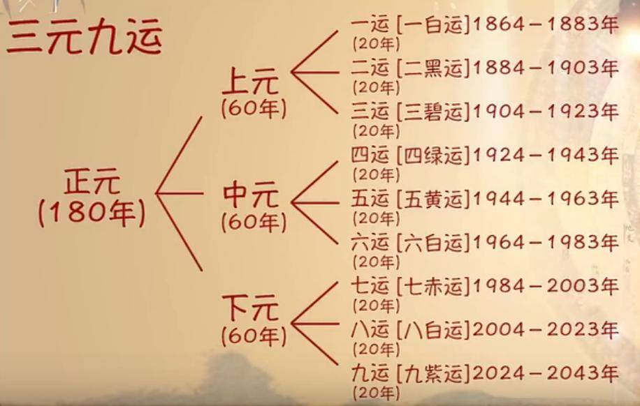 第二个60年,叫中元。也分成三分,就是3个20年。然后就是四运,五运六运。