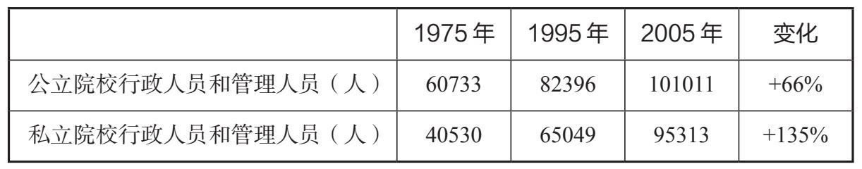 上图为本书引用的本杰明·金斯伯格的《高校教师团体之陨落》中,关于公立、私立院校行政人员和管理人员人数变化趋势。