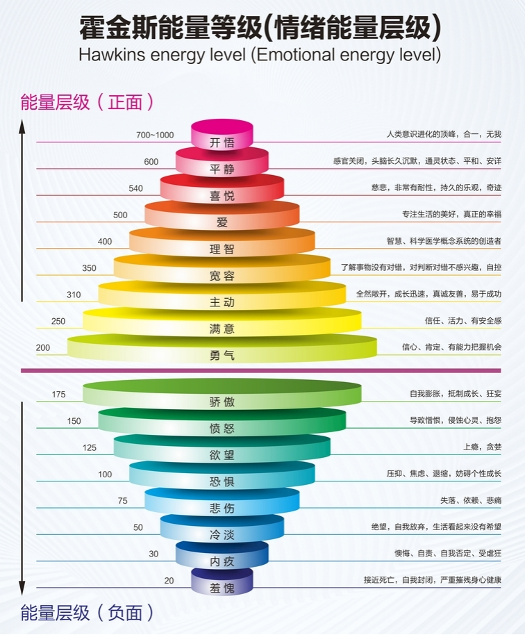 霍金斯能量层级理论将人类的意识状态划分为17个层级,每个层级对应不同的能量指数(从20到1000)。这些层级可以分为负能量层级(低于200)和正能量层级(高于200)。