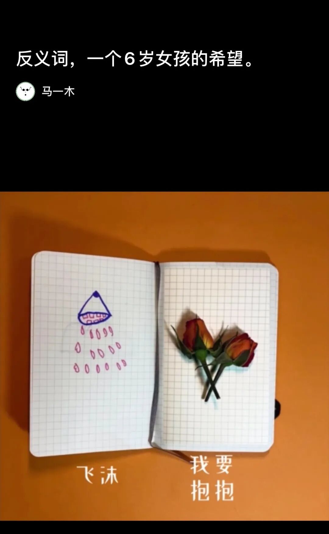 因为Mary的分享,想起朋友马一木最近分享的和他女儿一起创作的一首诗歌《反义词》(可以关注公众号「马一木」),这首歌里,马浅浅说:「飞沫」的反义词是「我要抱抱」,孩童的这份天真直戳我心底。