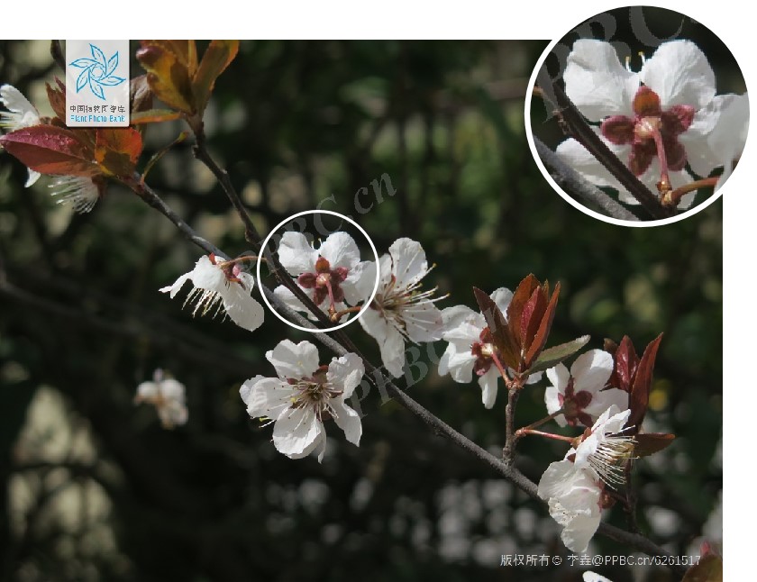 紫叶李的白色花瓣和紫红色花萼(图源:PPBC):