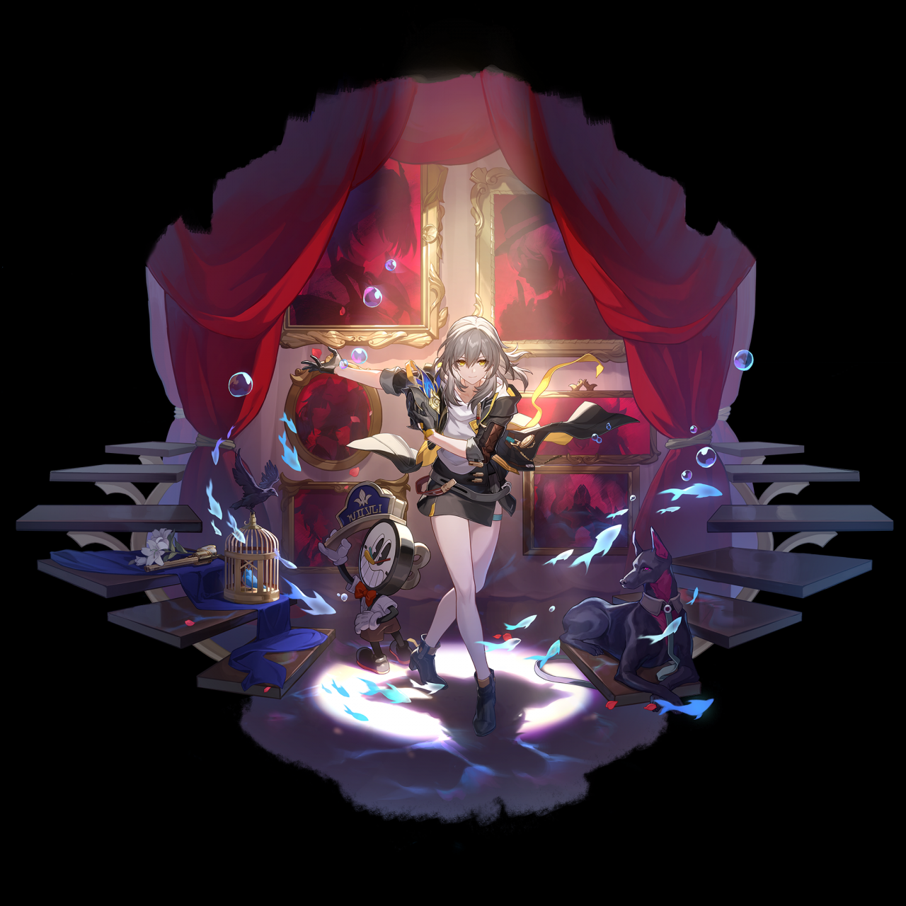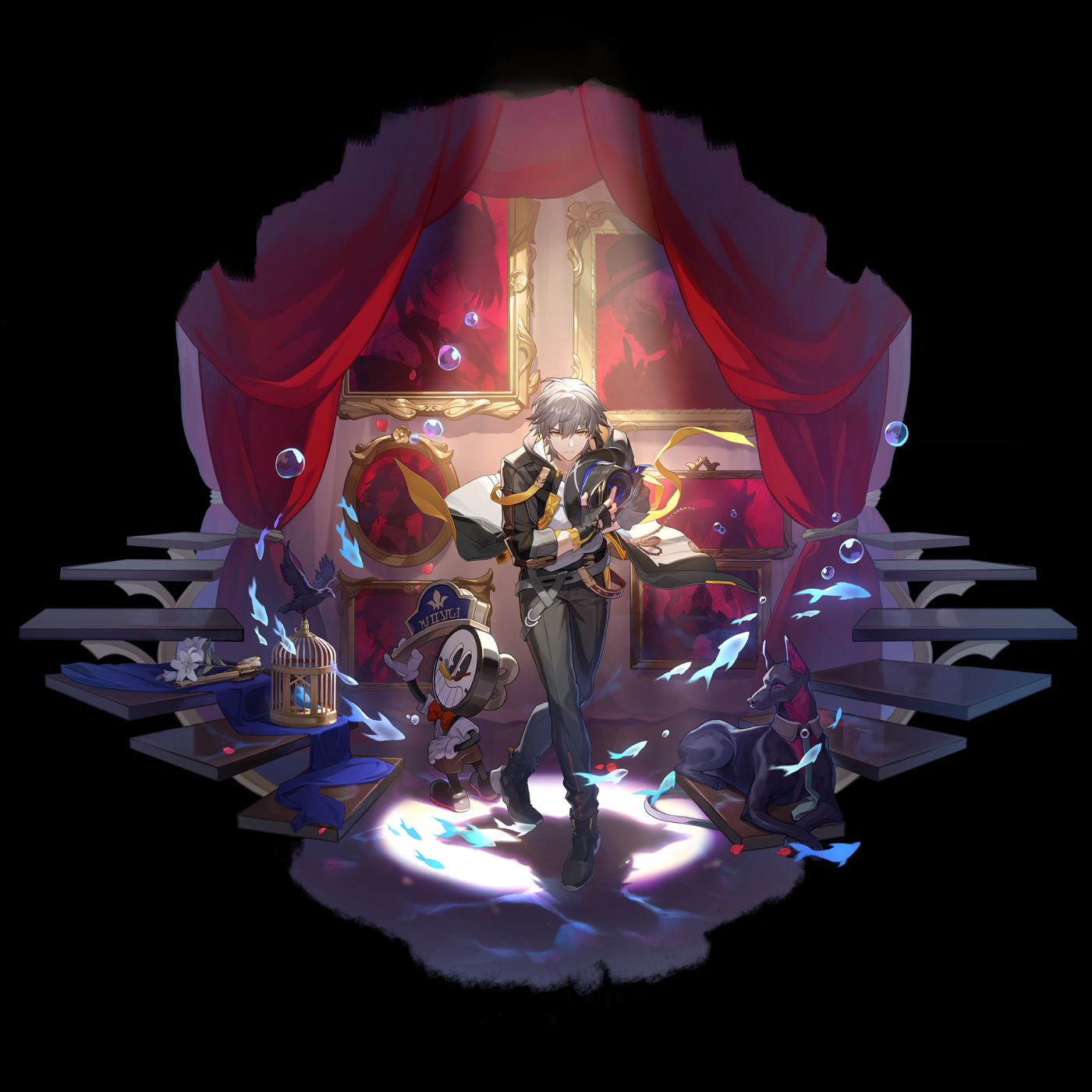 【开拓者•同谐(星)立绘】(要素从左至右包含:波提欧的左轮、笼中鸟、黄泉、花火、黑天鹅、钟表小子、砂金、流萤、加拉赫)