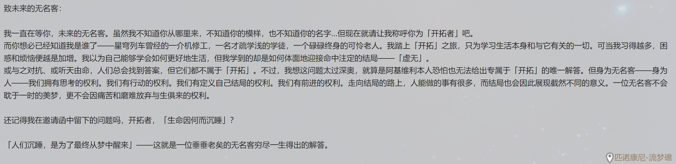 欢迎收听游戏《崩坏:星穹铁道》的剧情解读!时隔三周,我们的节目终于迎来了匹诺康尼剧情的重头戏,2.2版本:“等醒来再哭泣”。
