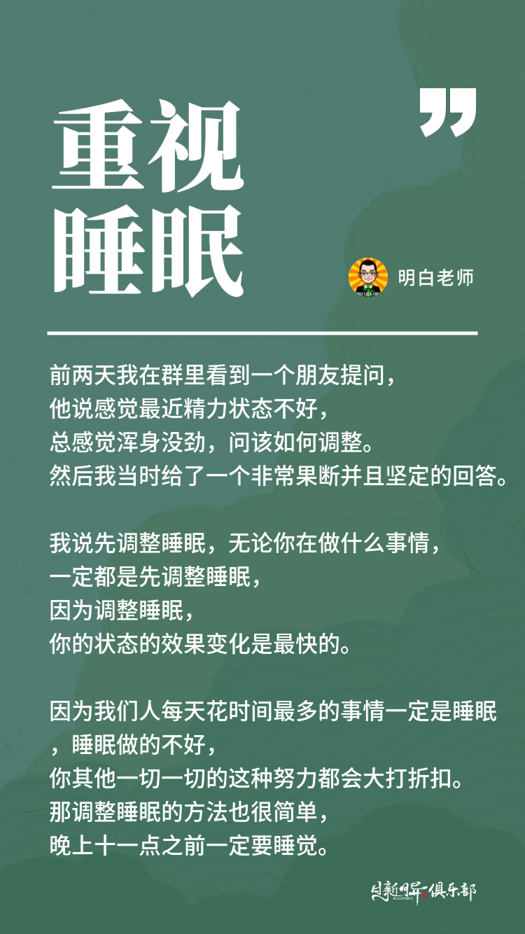 前两天我在群里看到一个朋友提问,他说感觉最近精力状态不好,总感觉浑身没劲,问该如何调整。然后我当时给了一个非常果断并且坚定的回答。我说先调整睡眠,无论你在做什么事情,一定都是先调整睡眠,因为调整睡眠,你的状态的效果变化是最快的。