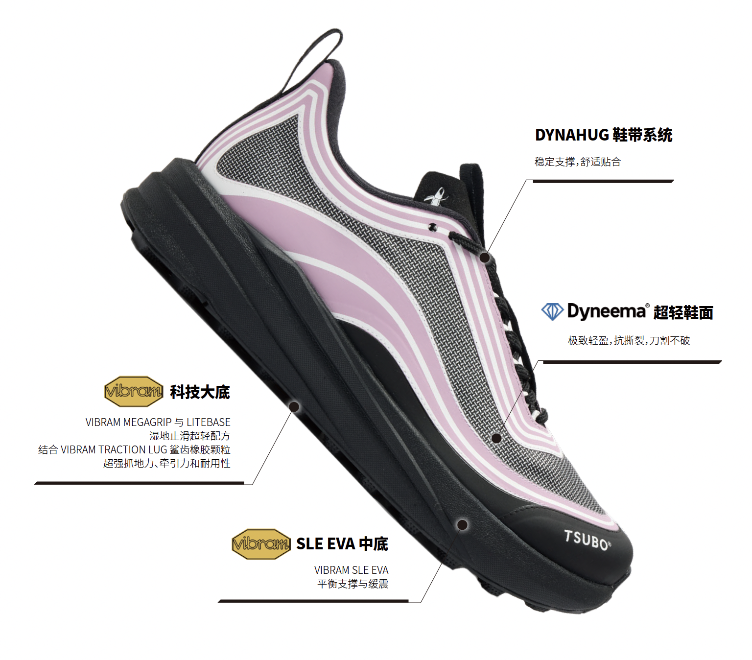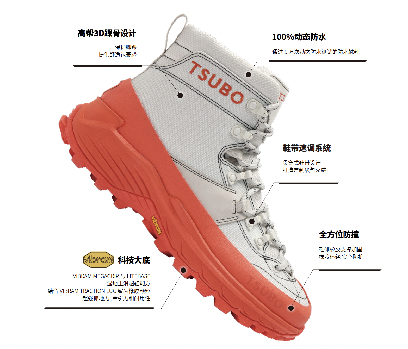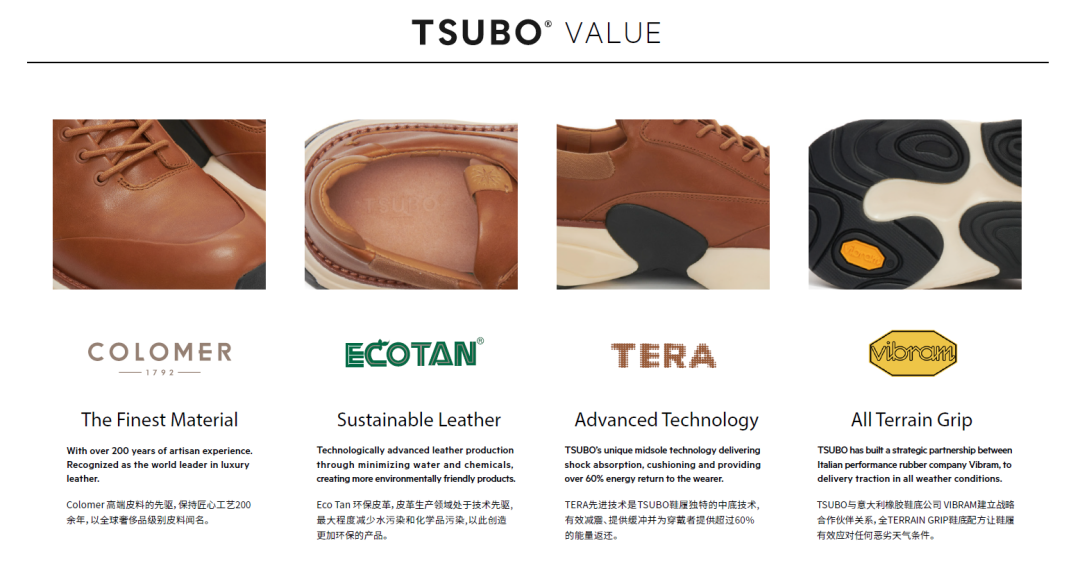 在产品上,TSUBO 秉承四大价值,即:高端皮料的先驱 Colomer、环保皮革 Eco Tan、TERA 先进技术(TSUBO 鞋履独特的中底技术,可有效减震/提供缓冲等)、与意大利橡胶鞋底公司 VIBRAM 建立战略合作伙伴关系(全 TERRAIN GRIP 鞋底配方让鞋履有效应对任何恶劣天气条件)。
