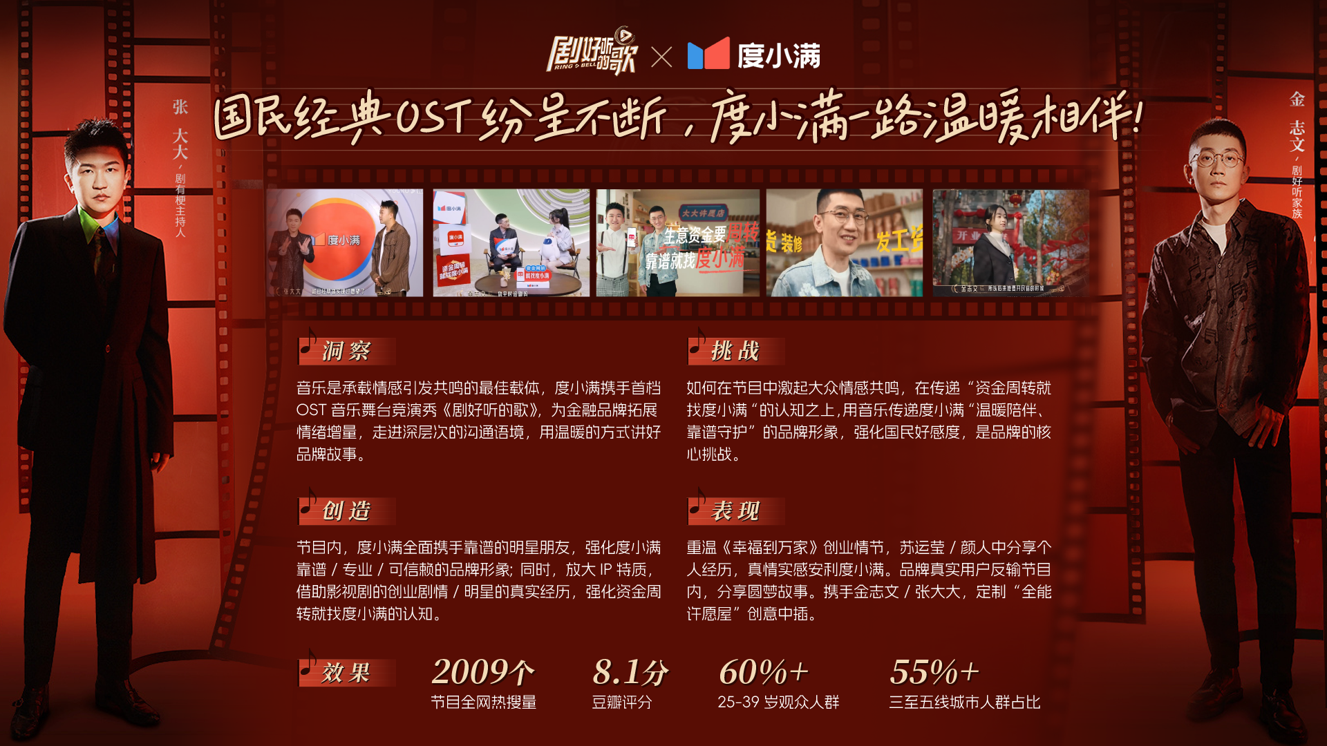 度小与《剧好听的歌》的合作,是一段温暖的生意佳话。度小满借势国民明星的影响力,深度参与节目内容,通过绑定国民大咖、融入核心赛制、陪伴明星群聊互动等方式,强化了“资金周转就找度小满”的平台认知。节目中的温暖生意故事、明星的真实经历分享,以及度小满真实用户的登场,都让用户感受到了品牌的温暖与力量。这一系列的营销传播,不仅提升了度小满的品牌声量,更在国民中坚群体中建立了专业、可信赖的品牌形象,让品牌在消费者心中扎下深根。