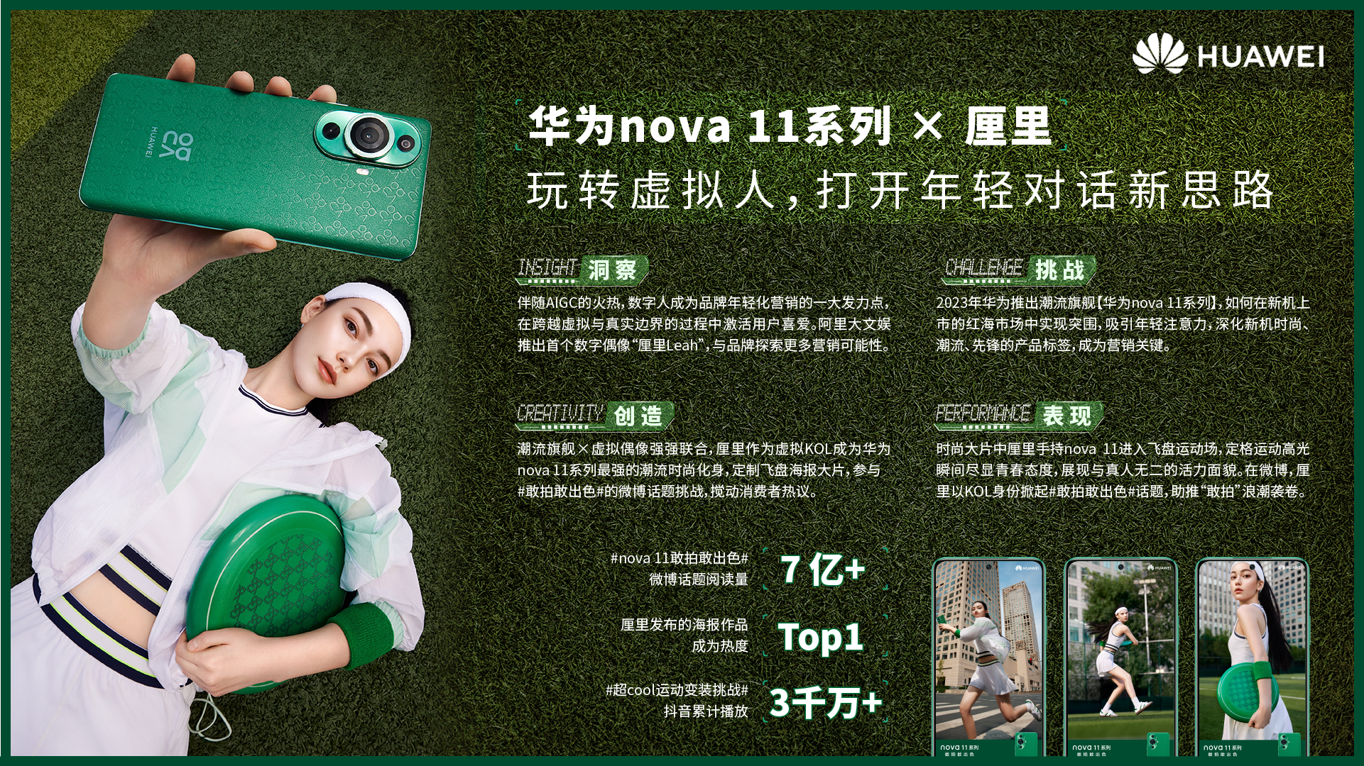 华为nova 11与虚拟人厘里的合作,是科技与营销的奇妙邂逅。在新机上市的激烈竞争中,华为nova11大胆创新,与虚拟人厘里携手,开启全新营销模式。厘里以潮流先锋的形象,在社交平台上掀起“敢拍敢出色”的话题热潮,参与抖音挑战赛,与真人无二地展现高级质感,积极融入Z世代的运动潮流。这种虚拟形象营销的突破,不仅深化了华为nova 11“时尚”“潮流”“先锋”的品牌标签,更在年轻群体中树立了全新的科技形象,为品牌销量的提升注入了强劲动力,成为科技营销的典范。