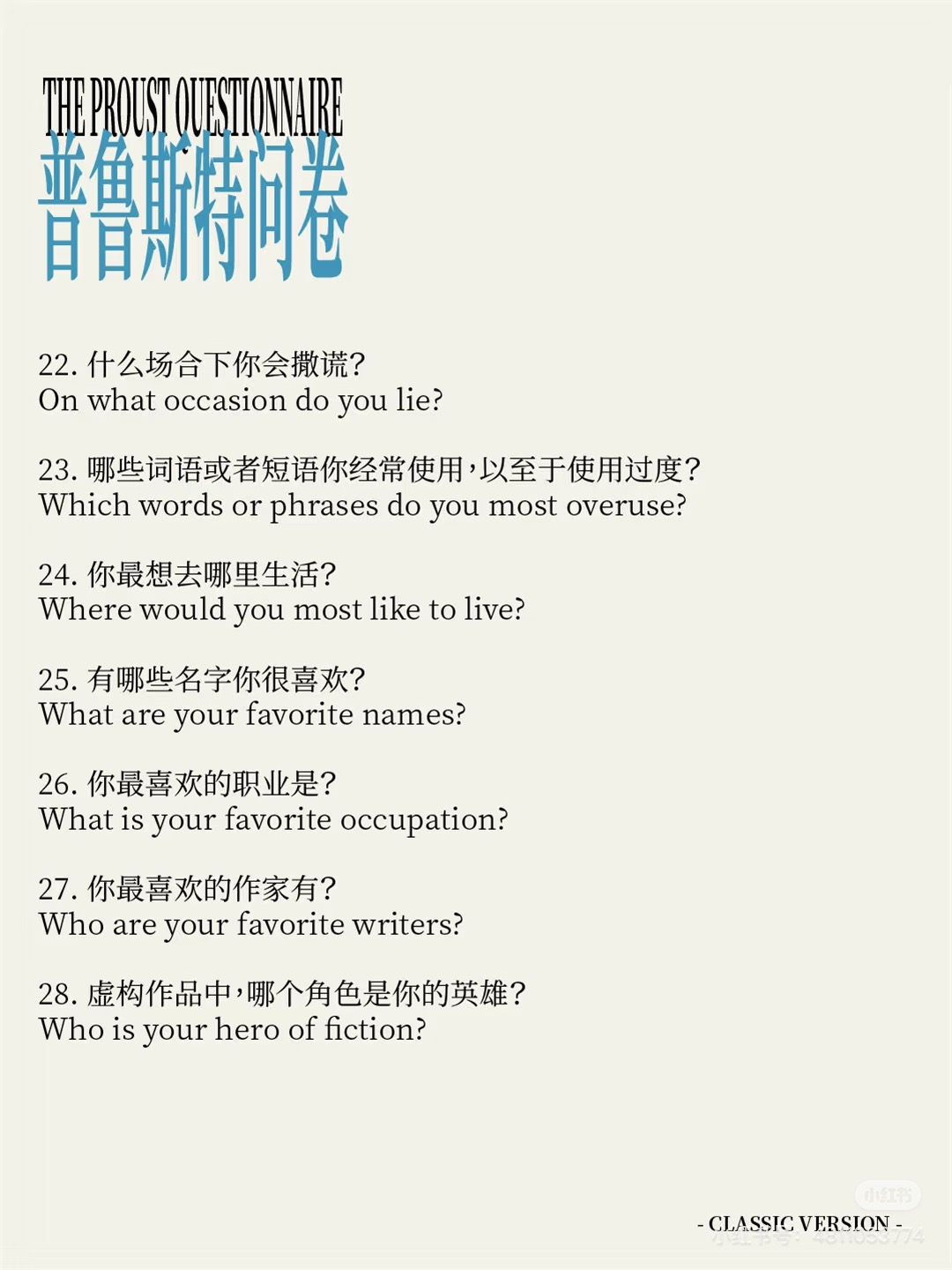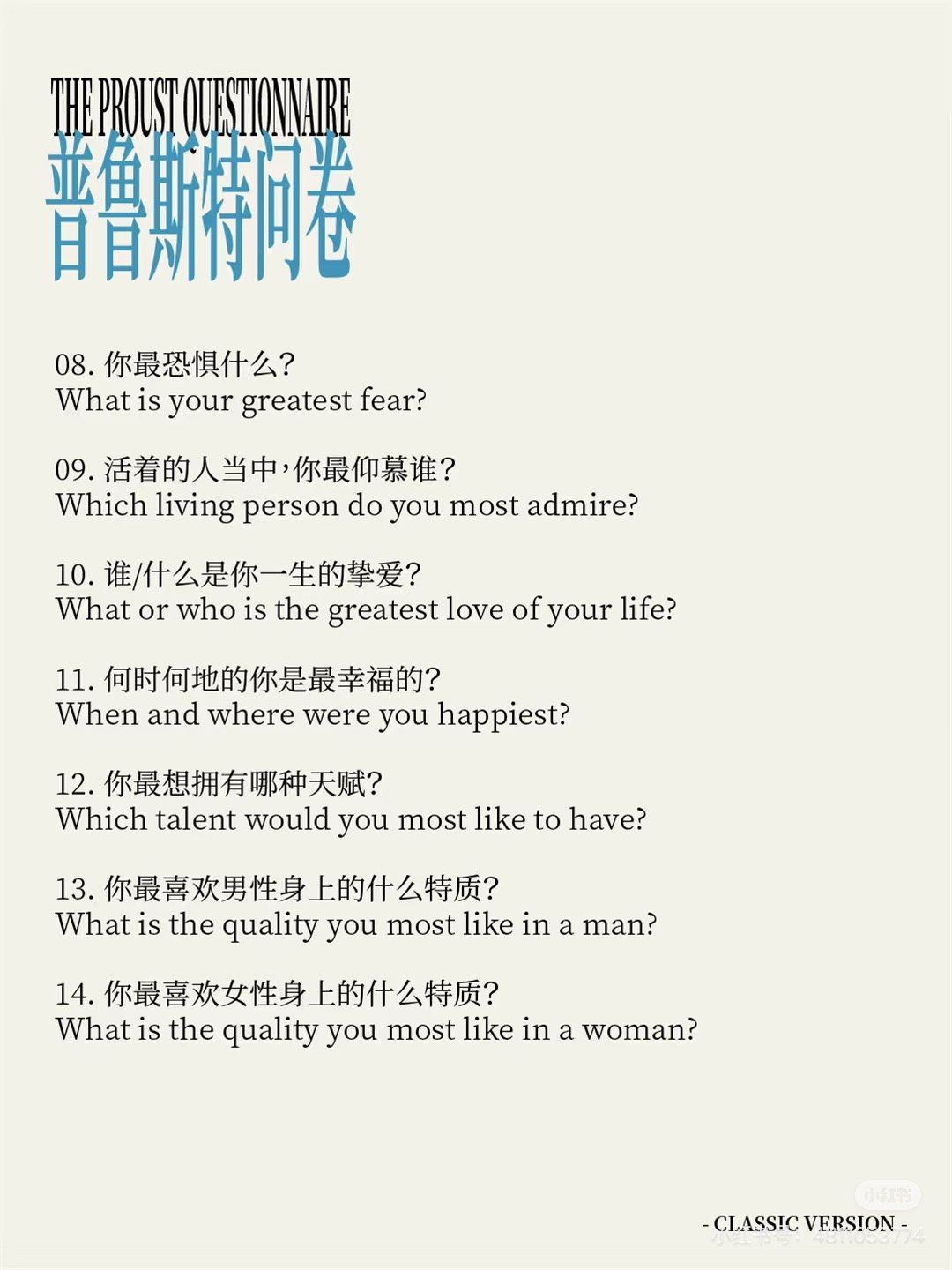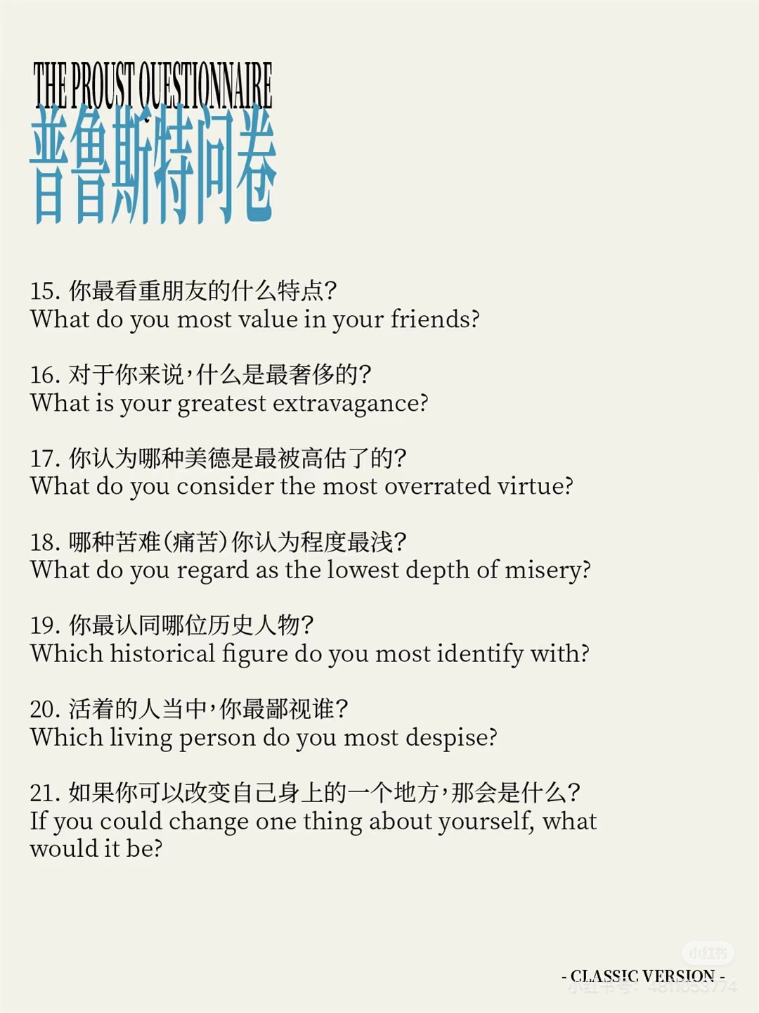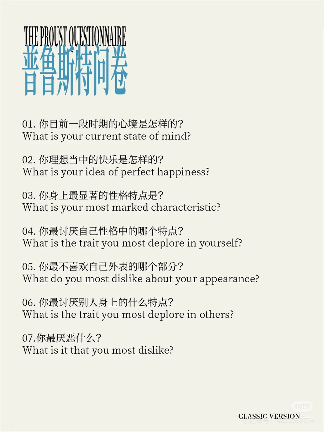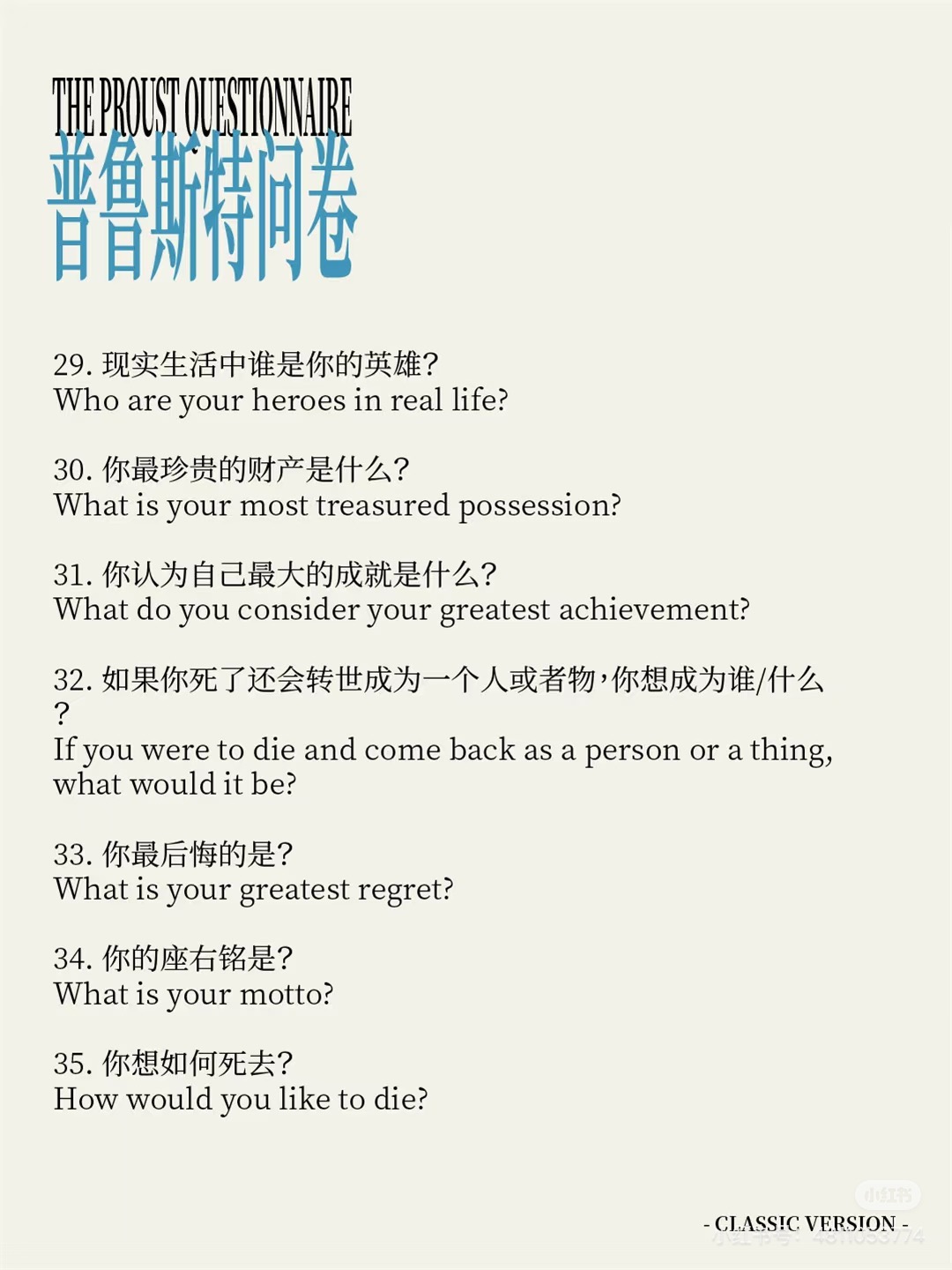 在节目的第二部分为【请回答普鲁斯特】(灵感来自同名播客)在这里我们把这35个问题附上,让我们通过这几个问题,离彼此更近一些。在回答的过程中,停顿的部分没有剪掉,保留了真是的思考的间隙。希望大家听的开心。