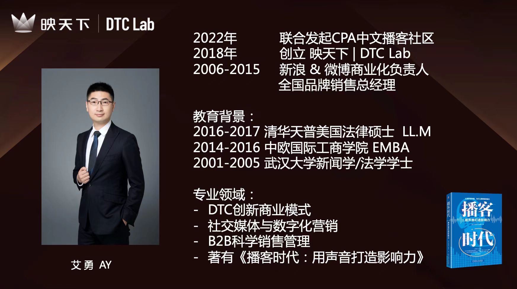 艾勇是一位横跨品牌营销、内容商业化与新媒体生态的战略型创业者,长期深耕DTC品牌战略、内容分发与影响者经济,推动了中国MCN行业从平台流量红利迈向全链路商业能力的跃升。 作为中文播客领域头部社群【CPA中文播客社区】的联合发起人,他持续推动行业标准建设,致力于挖掘优质声音内容与可持续的内容商业模式。他也是《DTC Lab|未来品牌之路》,《成为巴菲特》,《美妆内行人》,《A-Log|艾勇的声音日志》,《CPA超频对话》,《社交千斤顶》等十余档播客的主理人/常驻嘉宾,在行业观察、趋势判断和跨界连结上具深度影响力。