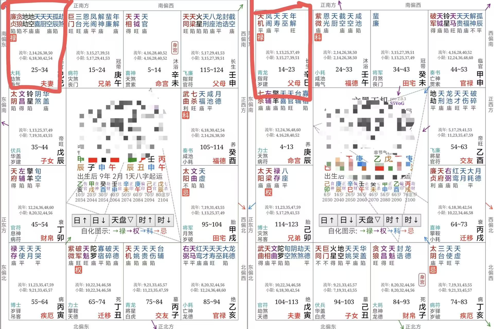 自己命宫内的主星是否在对方的夫妻宫内,反之亦然(参考下图,命宫的“天机星”也在对方夫妻宫内)