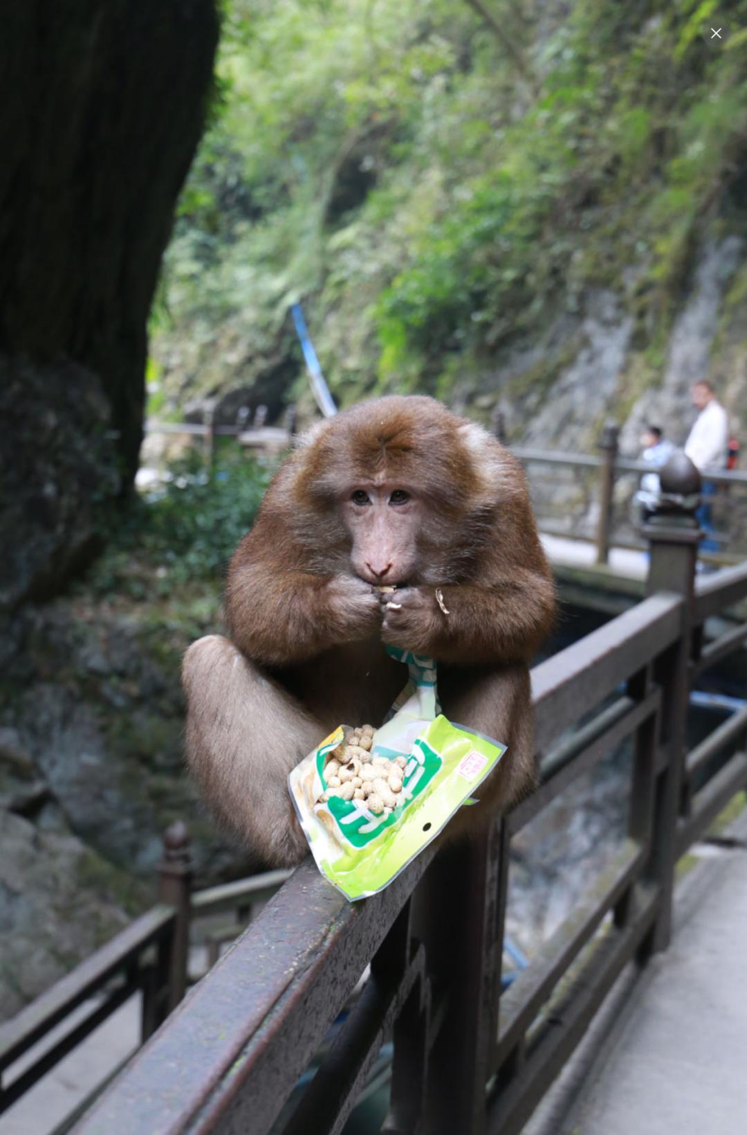 图:吃包装花生的猴子(图源:澎湃新闻)