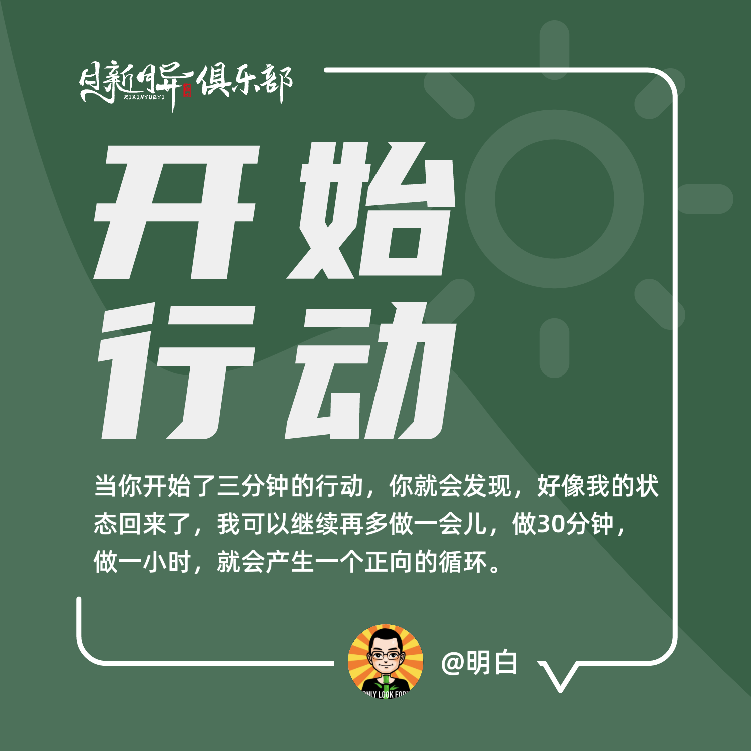 OK这是一个在日常生活中,可能如果你也发现我有时候有点懒,有点懈怠,有点不想动,但那些事情又是必须去做的,那就告诉自己我只做三分钟,三分钟做完我就不做了。当你开始了三分钟的行动,你就会发现,好像我的状态回来了,我可以继续再多做一会儿,做30分钟,做一小时,那就会产生一个正向的循环。