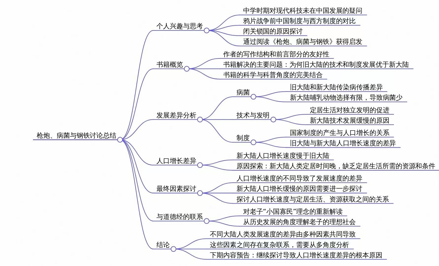 我在中学时期就一直有一个疑问,为什么现代科技没有在中国发展起来,如果我们将原因归结为制度的话,那为什么西方产生了这样的制度,而为什么中国到鸦片战争之前都没有产生呢?这些问题直到我读完了这本《枪炮病菌与钢铁》,我感觉到自己离答案非常的接近了,之后又去了解了一些中国思想发展史和西方思想发展史的书,终于得到了对于我自己来说一个逻辑自洽的答案。