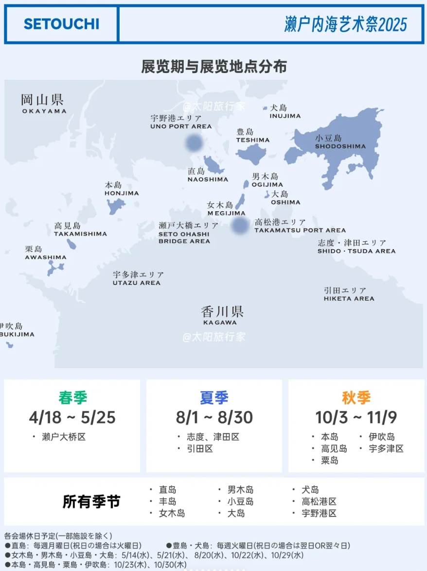 2025年濑户内国际艺术祭:分为春(4月18日-5月25日)、夏(8月1日-8月31日)、秋(10月3日-11月9日)三个展期,横跨濑户内海多个岛屿,经典玩法为“跳岛”,乘船往返于各岛之间,船舶时间固定,各展馆预约需精确到具体时段。本届主题为“海之复权”(Revitalization of the Sea)。