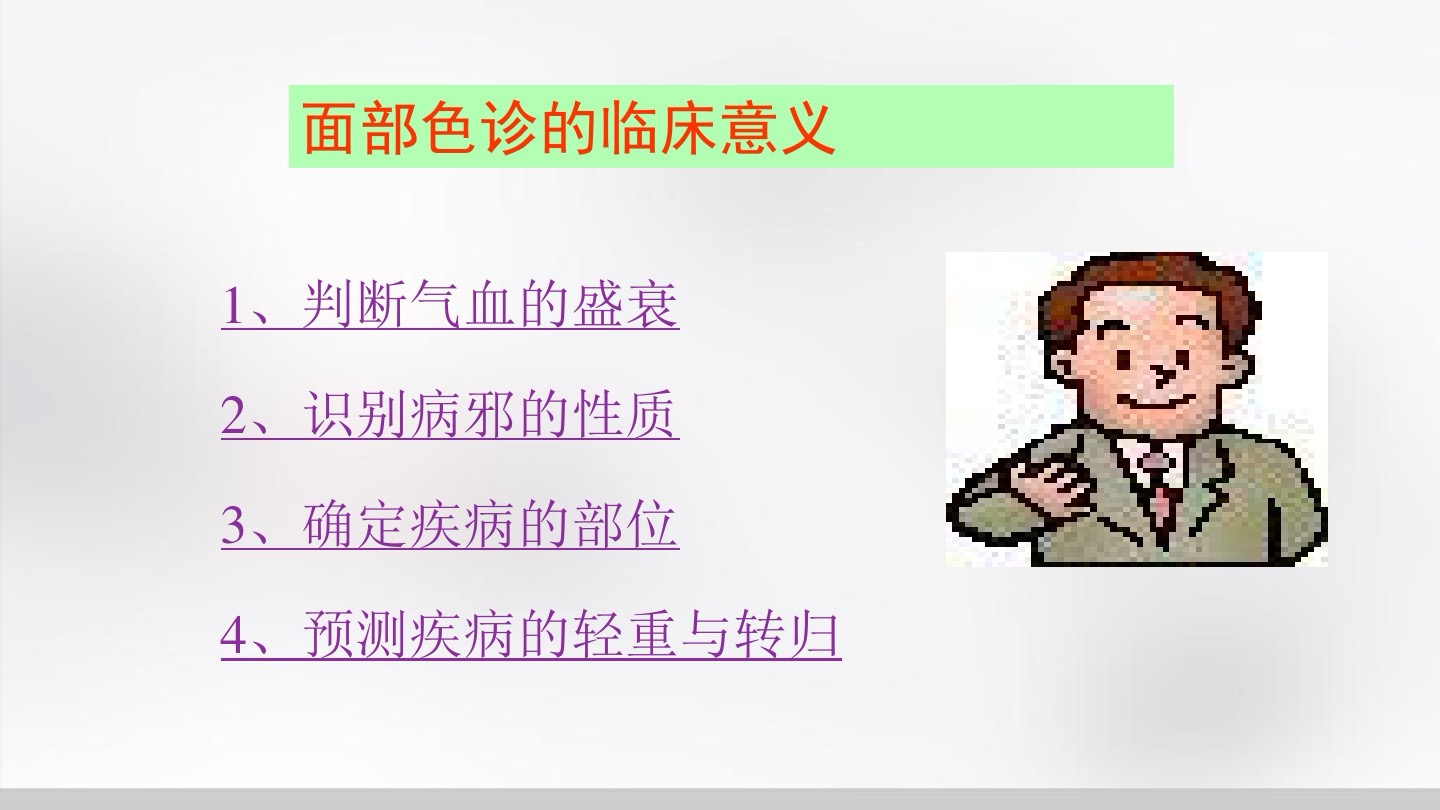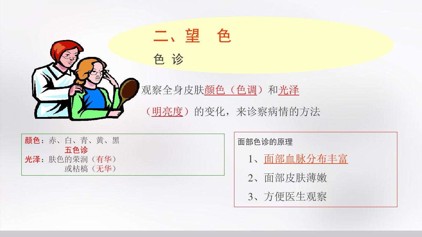1.色泽 皮肤色泽亦可见五色,五色诊亦适用于皮肤望诊。临床常见而又有特殊意义者,为发赤、发黄。