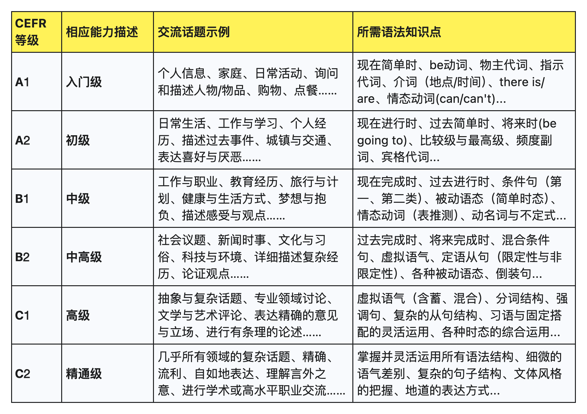- CEFR (欧洲语言共同参考框架):一个国际通用的语言能力评级标准,可以帮助你定位自己的语言水平,并找到相应难度的话题和语法点。点击了解CEFR标准