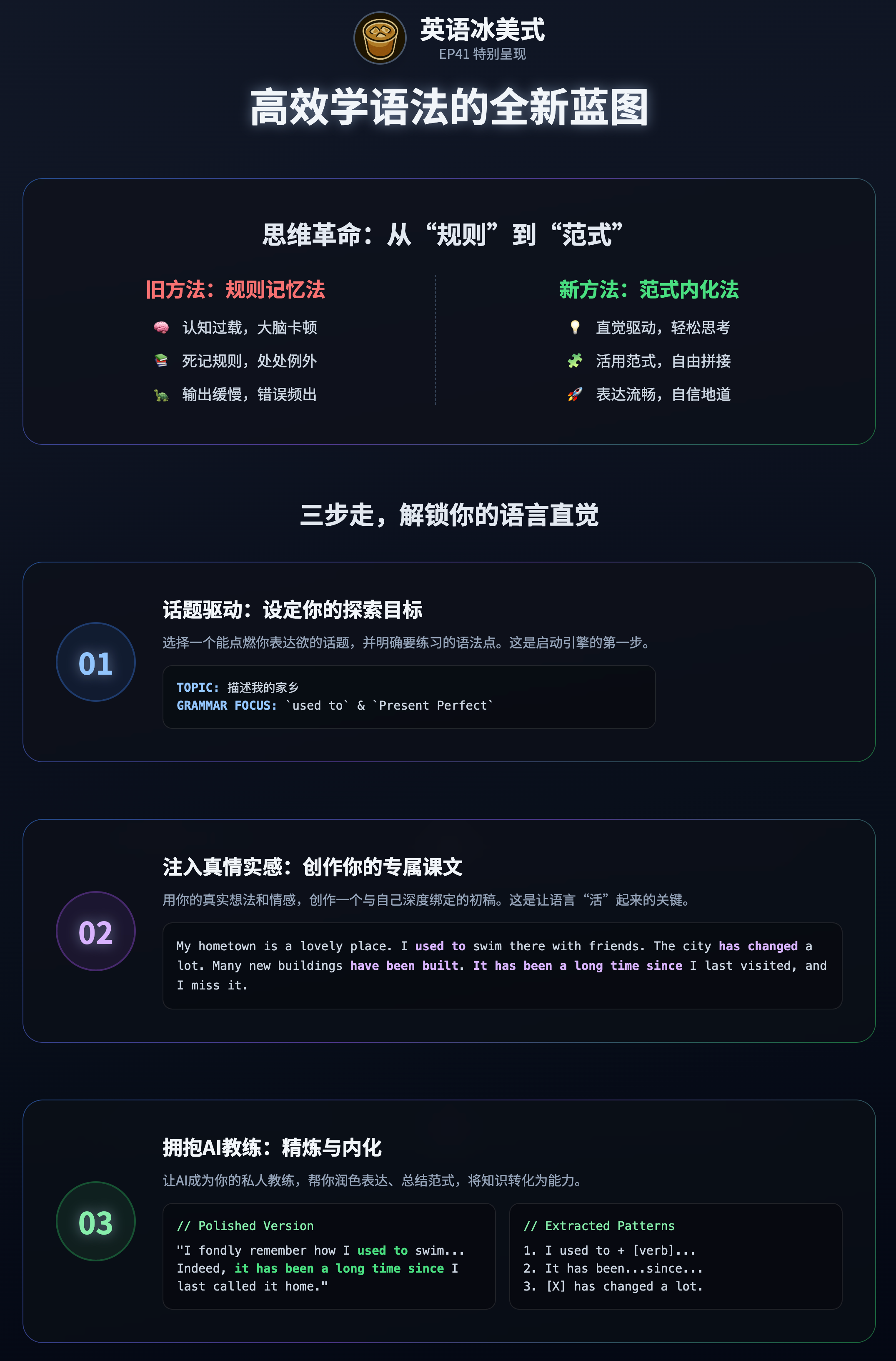 在本期节目中,我们将颠覆传统的语法学习模式。探讨为什么“规则记忆法”是一条充满挫败感的死胡同,并引入一种全新的、更符合大脑直觉的学习理念——学习范式(Patterns),而非规则(Rules)。
