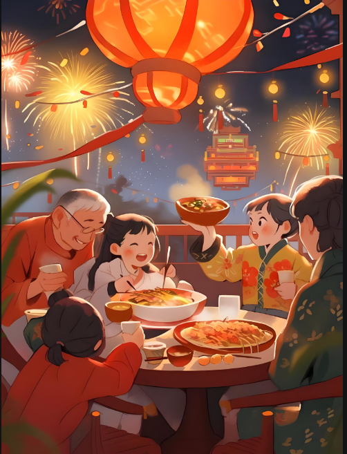 饭桌上,家人围坐,笑语盈盈,长辈们举杯祝福,孩子们欢声笑语,每个人的脸上都洋溢着幸福和满足。窗外,爆竹声声,烟花绽放,与屋内的温馨气氛相得益彰。这顿饭,吃的不仅是美味,更是一份情感的交流,一份文化的传承。年夜饭,是结束旧年、迎接新年的仪式,是每个中国人心中最温暖的记忆。