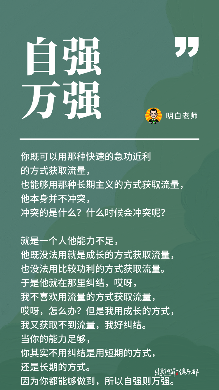 就是一个人他能力不足,他既没法用就是成长的方式获取流量,也没法用比较功利的方式获取流量。于是他就在那里纠结,哎呀,我不喜欢用流量的方式获取流量,哎呀,怎么办?但是我用成长的方式,我又获取不到流量。我好纠结。