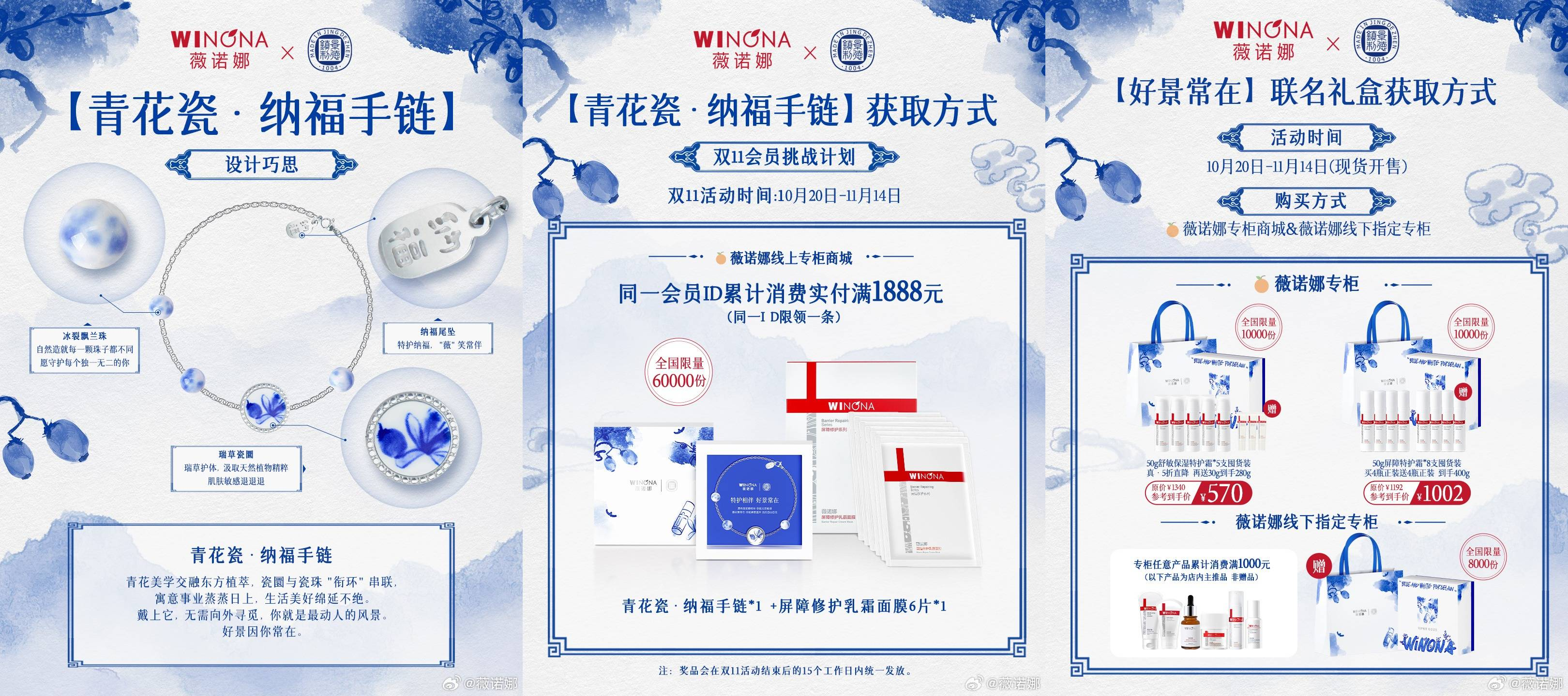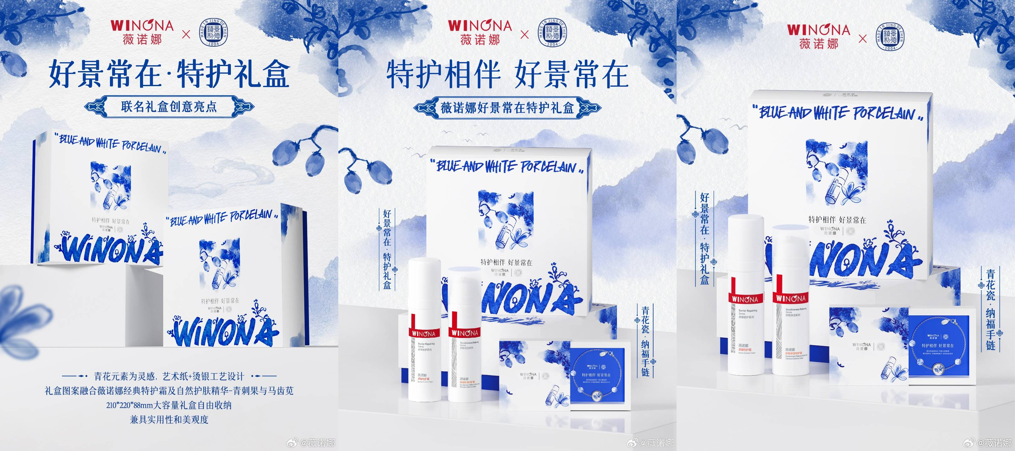 薇诺娜与景德镇制的联名礼盒和手链,将青花瓷元素融入现代护肤品设计中,提升了产品的文化价值,并为消费者提供了独特的审美体验。
