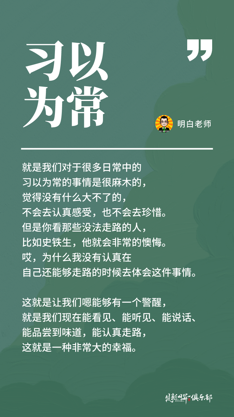 就是我们对于很多日常中的习以为常的事情是很麻木的,觉得没有什么大不了的,不会去认真感受,也不会去珍惜。但是你看那些没法走路的人,比如史铁生,他就会非常的懊悔。哎,为什么我没有认真在自己还能够走路的时候去体会这件事情。