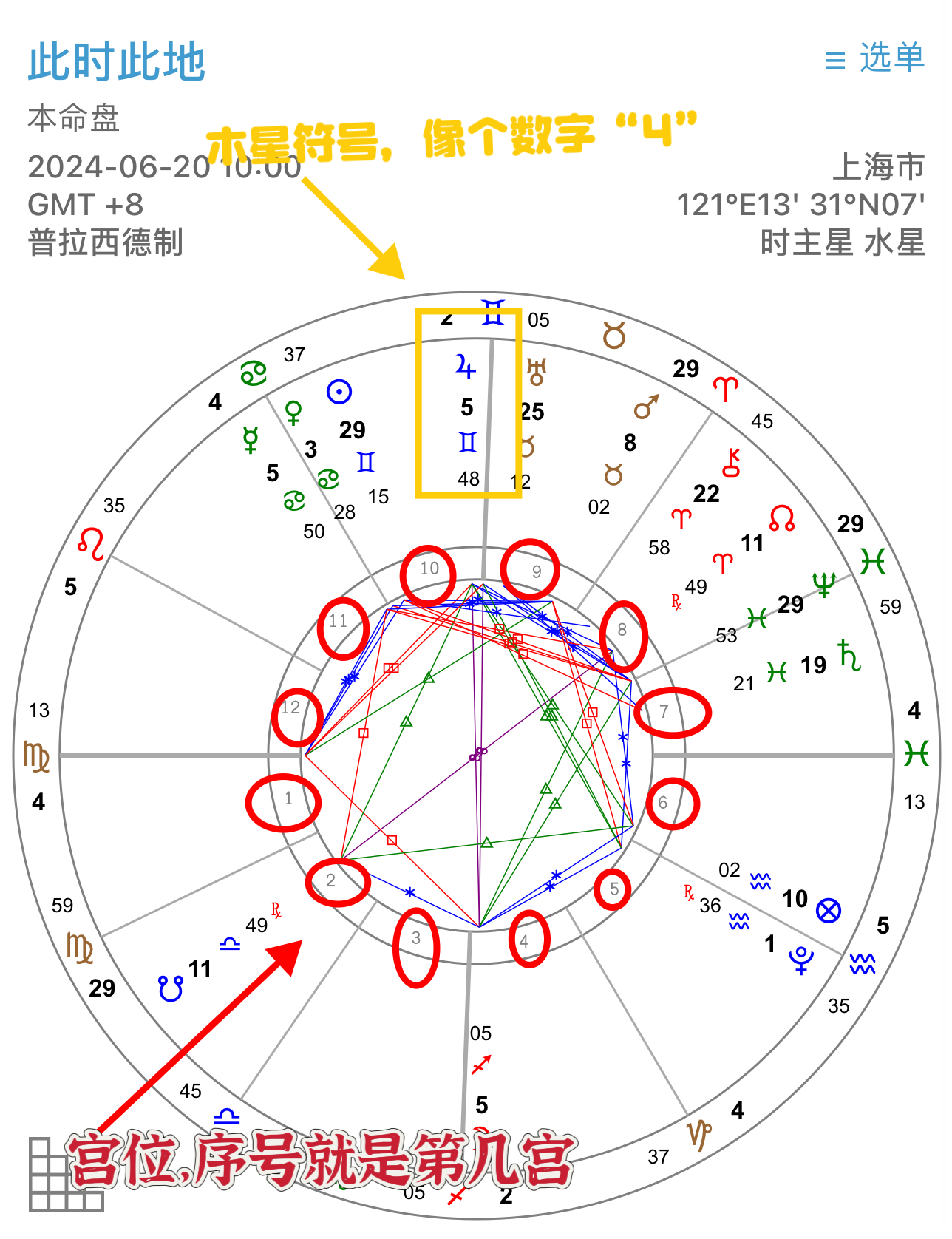 一张完整的星盘如下图所示,来寻找你的木星和宫位吧~
