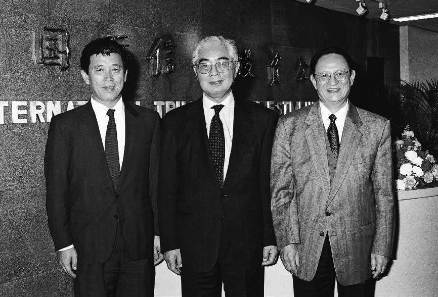 1993年3月,毅公当选国家副主席,辞去中信公司董事长,与中信第二任董事长魏鸣一和第三任董事长王军在京城大厦大堂合影留念
