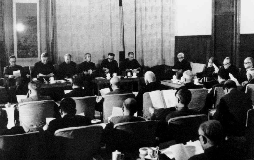 中信公司在人民大会堂召开第一次董事会。正面左起谷牧、荣毅仁、雷任民、吴志超