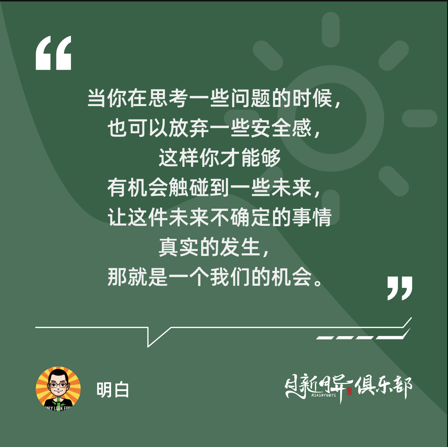 所以当你在思考一些问题的时候,也可以放弃一些安全感,这样你才能够有机会触碰到一些未来,让这件未来不确定的事情真实的发生,那就是一个我们的机会。