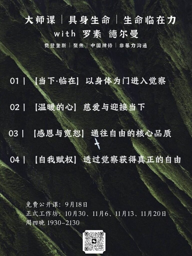 关注陈泉的微信公众号 @分身EmbodiedLiving 获取更多专业分享,播客中提到的「具身生命,生命临在力」课程信息如下,欢迎扫码咨询。